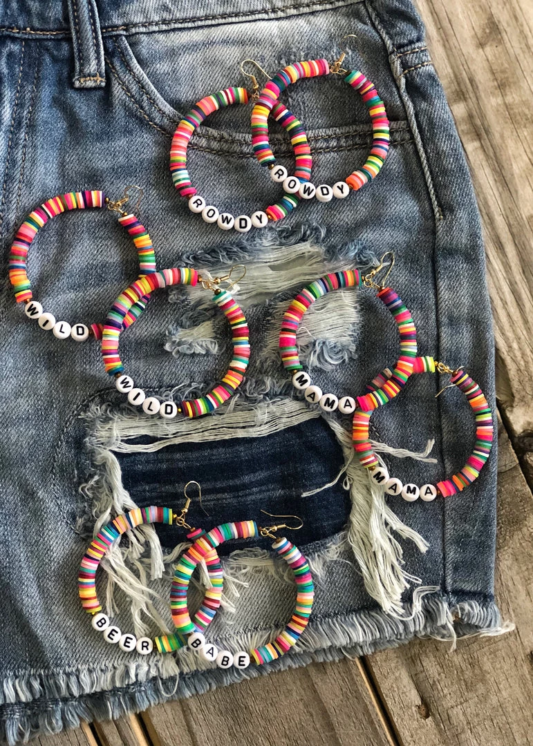 Colorful fully beaded hoop earrings with cute beaded wording. Earrings feature 4 gold beads separating the “word” from the colorful beads and then separating the colorful beads from the gold fish hook. Such a cute detail! Each Earring is hand made and are SO so fun and are a straight VIBE! Color pattern on beaded will vary due to the handmade quality.