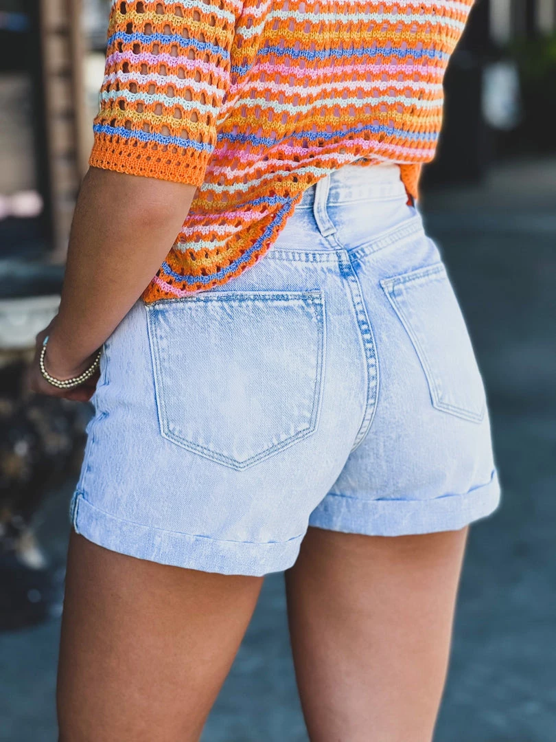 - High waist, distressed front with denim patches, cuffed hem, acid wash