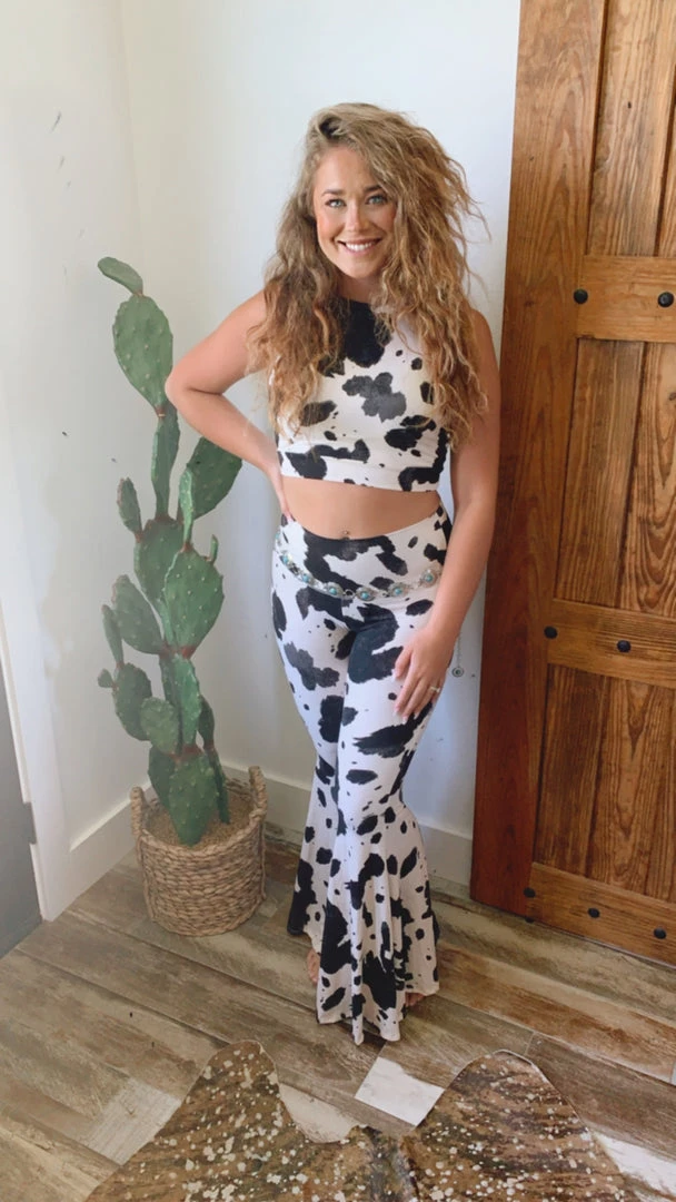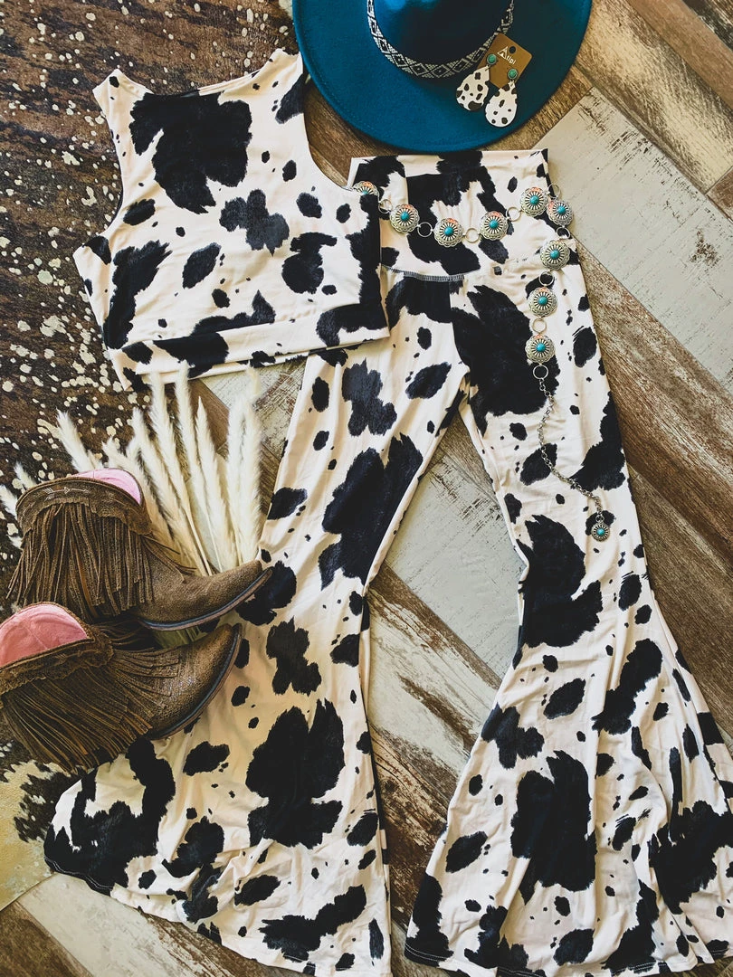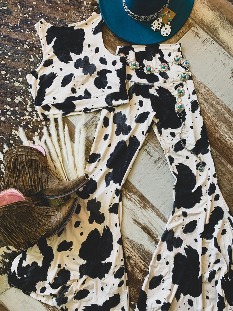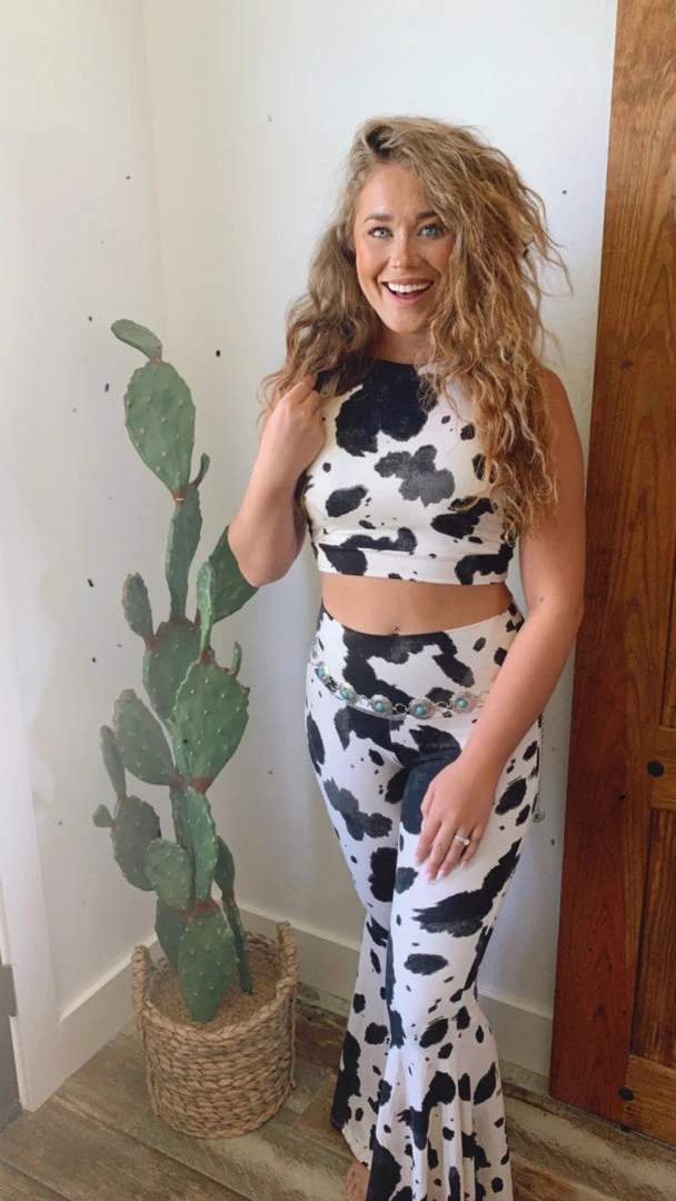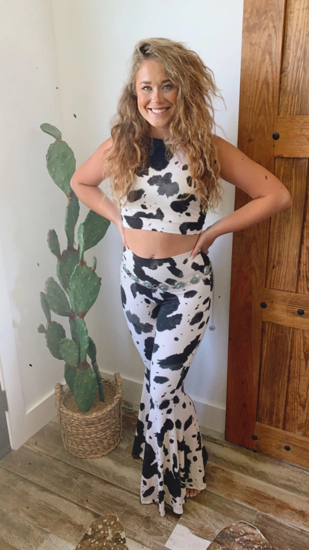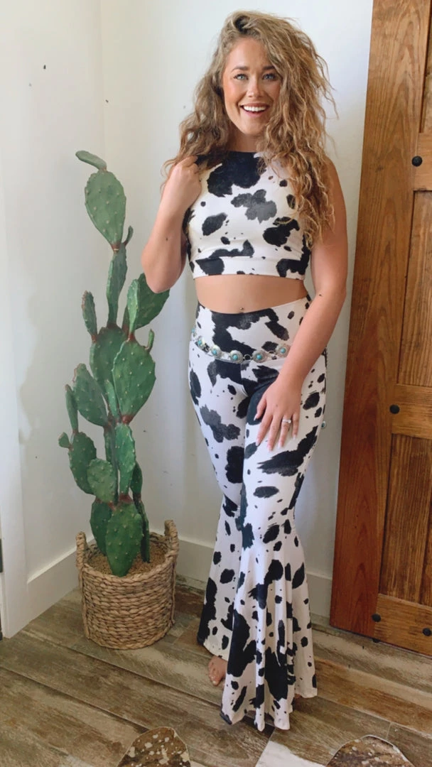 Black and white cow print two piece yoga lounge set will have you in love. Features a crop sleeveless top, high waisted bell bottoms, buttery soft fabric, a trendy cow print pattern, and the cutest most comfy fit. Top features a super soft buttery fabric, trendy cow print pattern, double layered fabric, a cropped length, and a smooth cropped waistband. Bell bottoms feature a smooth high waistband, trendy cow print, a wide leg flare, and supper soft buttery fabric. Perfect to run errands, lunch dates, or shopping trips! Pair with our Celina Hat in Teal and our Nevada Earrings for the complete look!