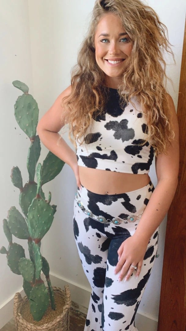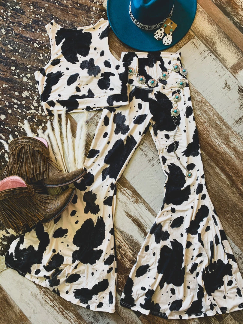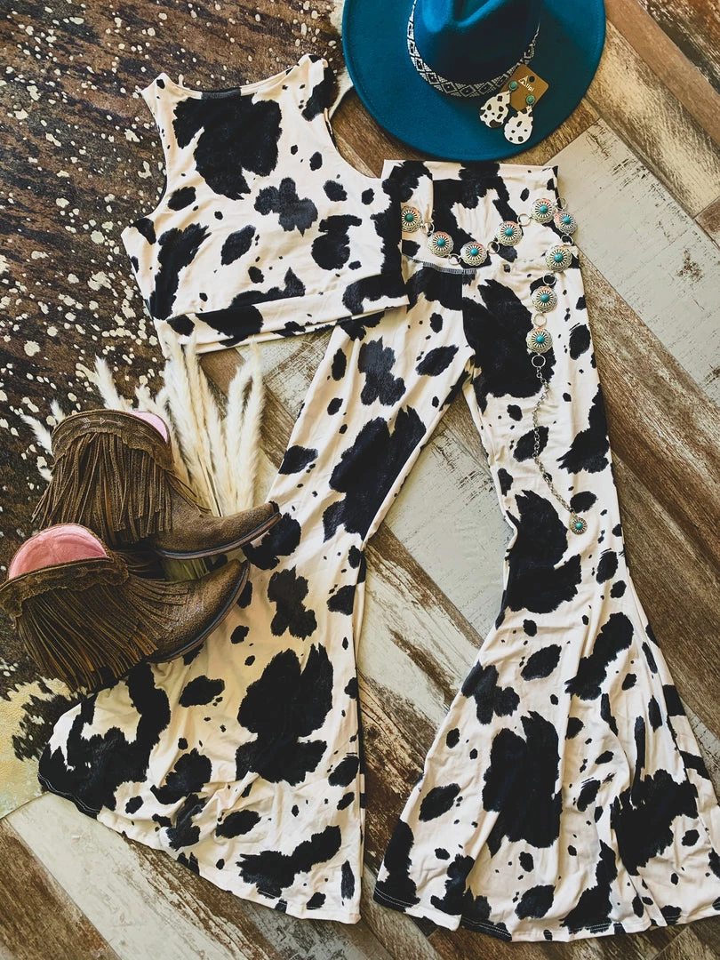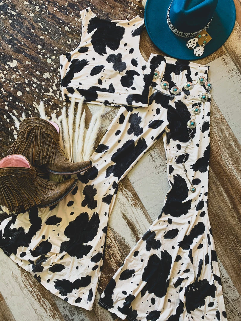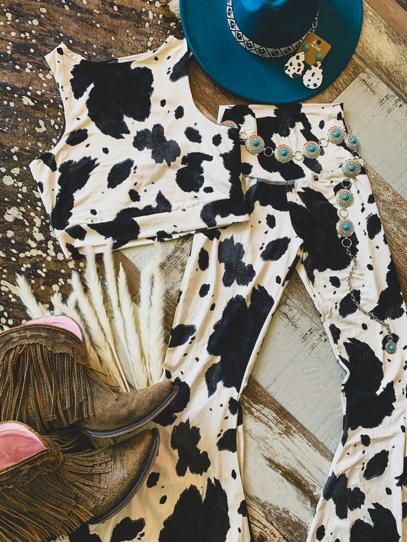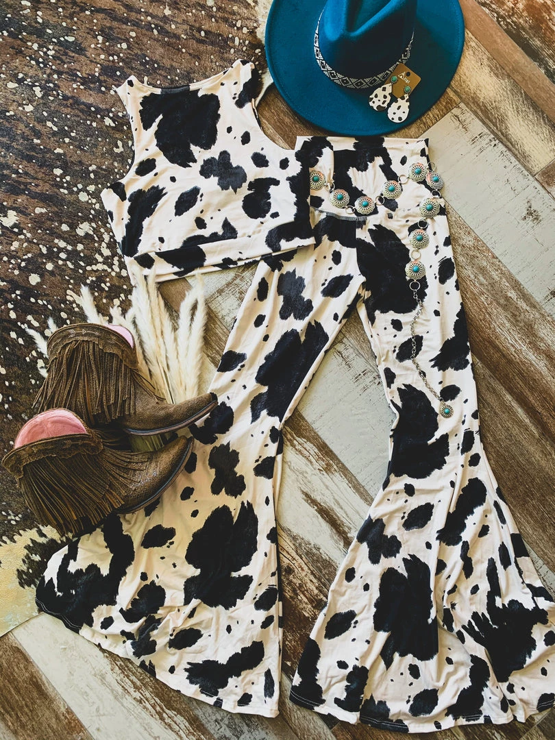 Black and white cow print two piece yoga lounge set will have you in love. Features a crop sleeveless top, high waisted bell bottoms, buttery soft fabric, a trendy cow print pattern, and the cutest most comfy fit. Top features a super soft buttery fabric, trendy cow print pattern, double layered fabric, a cropped length, and a smooth cropped waistband. Bell bottoms feature a smooth high waistband, trendy cow print, a wide leg flare, and supper soft buttery fabric. Perfect to run errands, lunch dates, or shopping trips! Pair with our Celina Hat in Teal and our Nevada Earrings for the complete look!