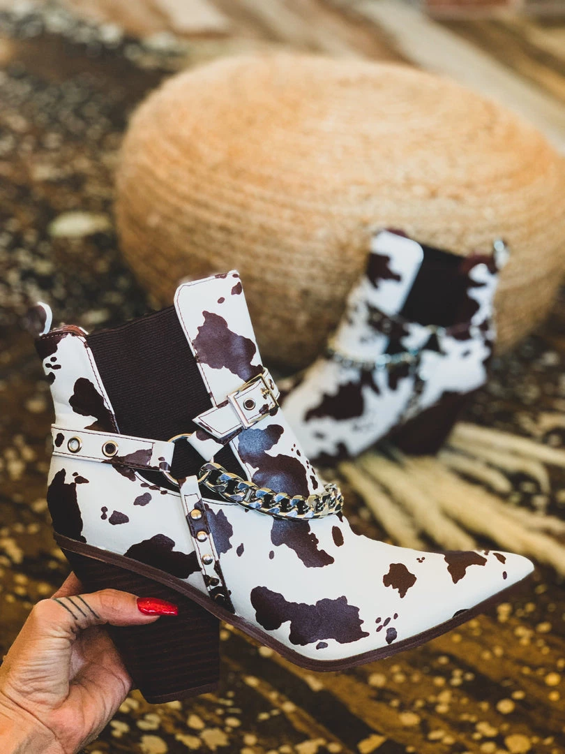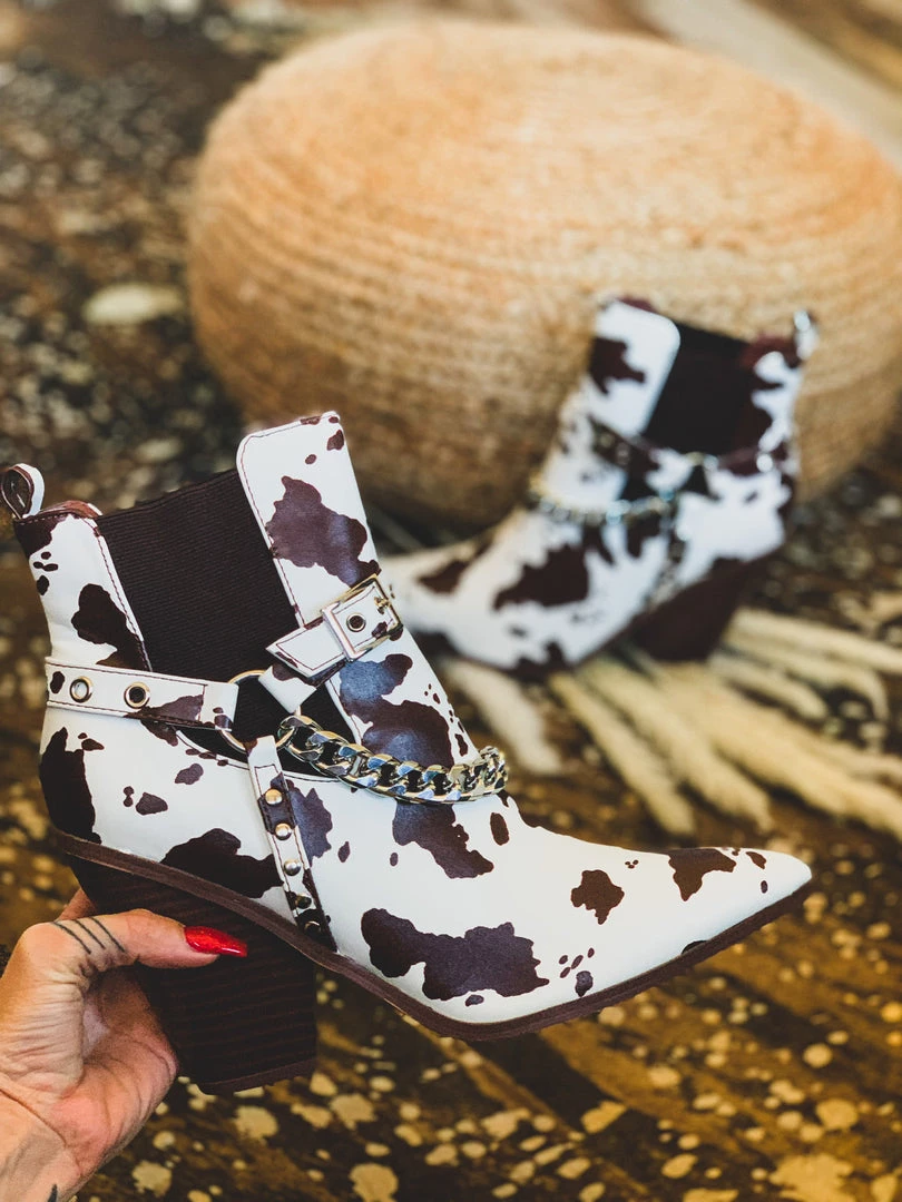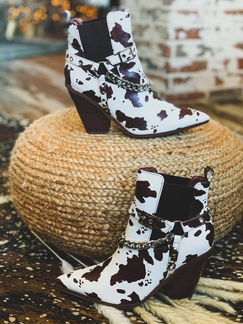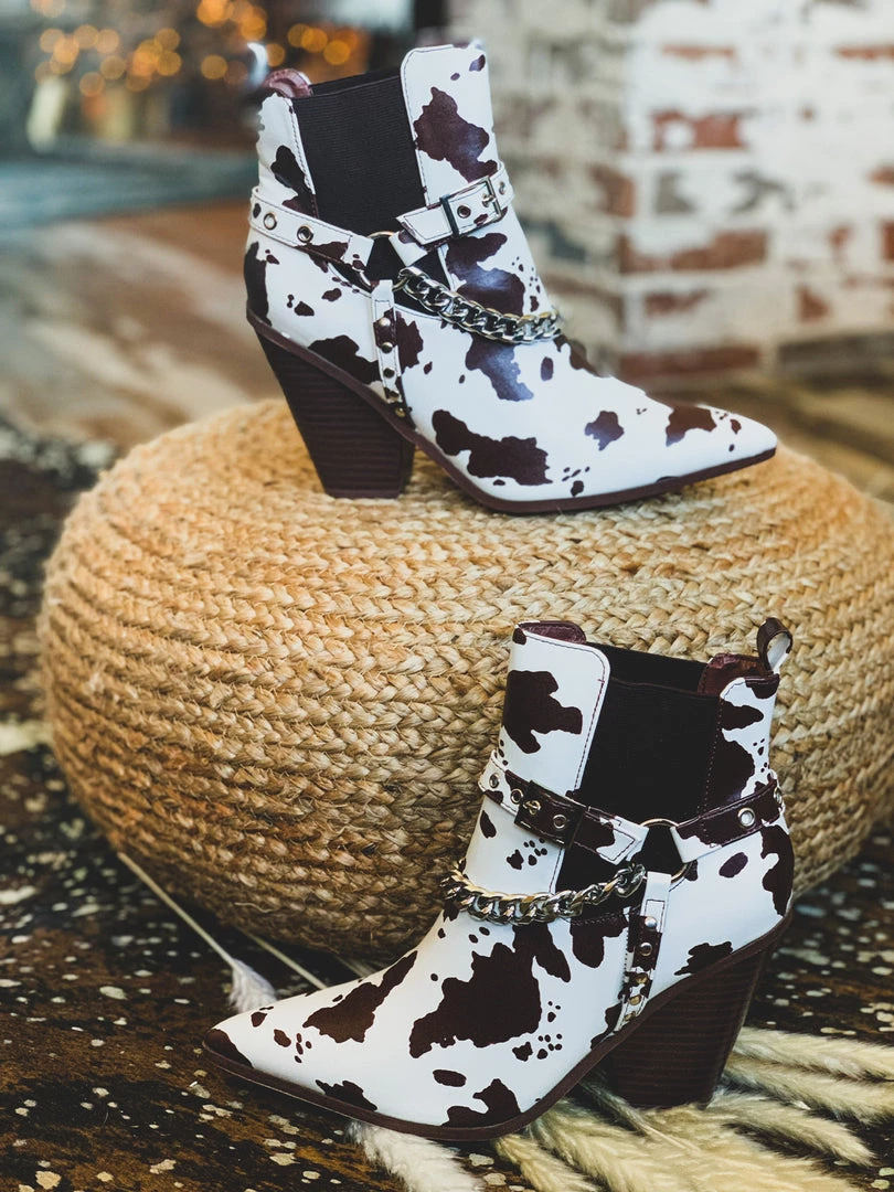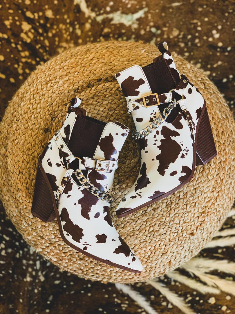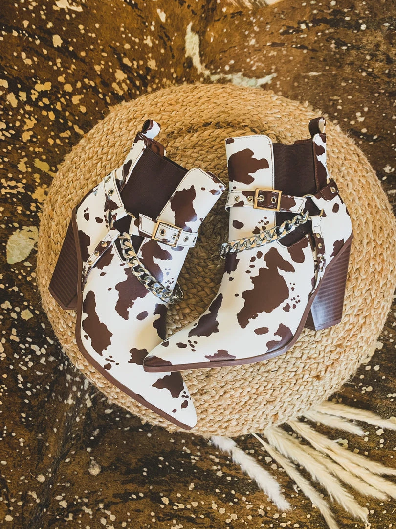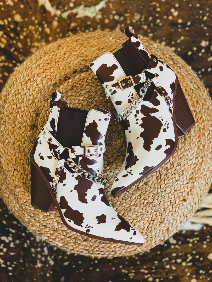 Gorgeous chocolate brown and cream cow print leather pull on ankle booties for that shoe win! Booties feature a brown and cream cow print pattern front with an almond pointed toe, brown elastic inserts, a silver chain detail, an adjustable buckle detail, and comfy stacked heel. Get ready for ALL the BEST compliments. The outfit choices are endless!