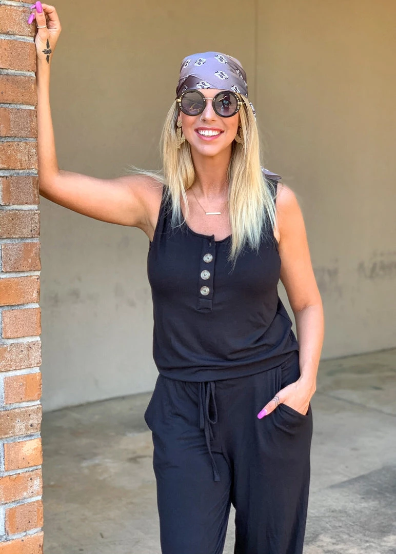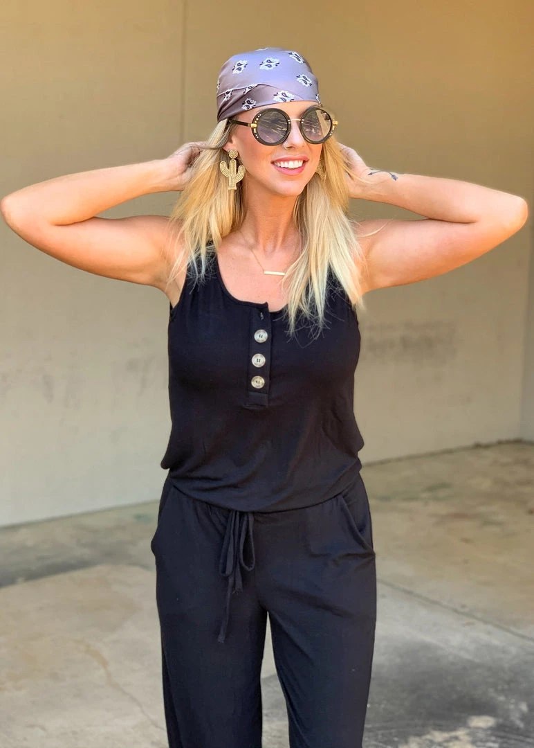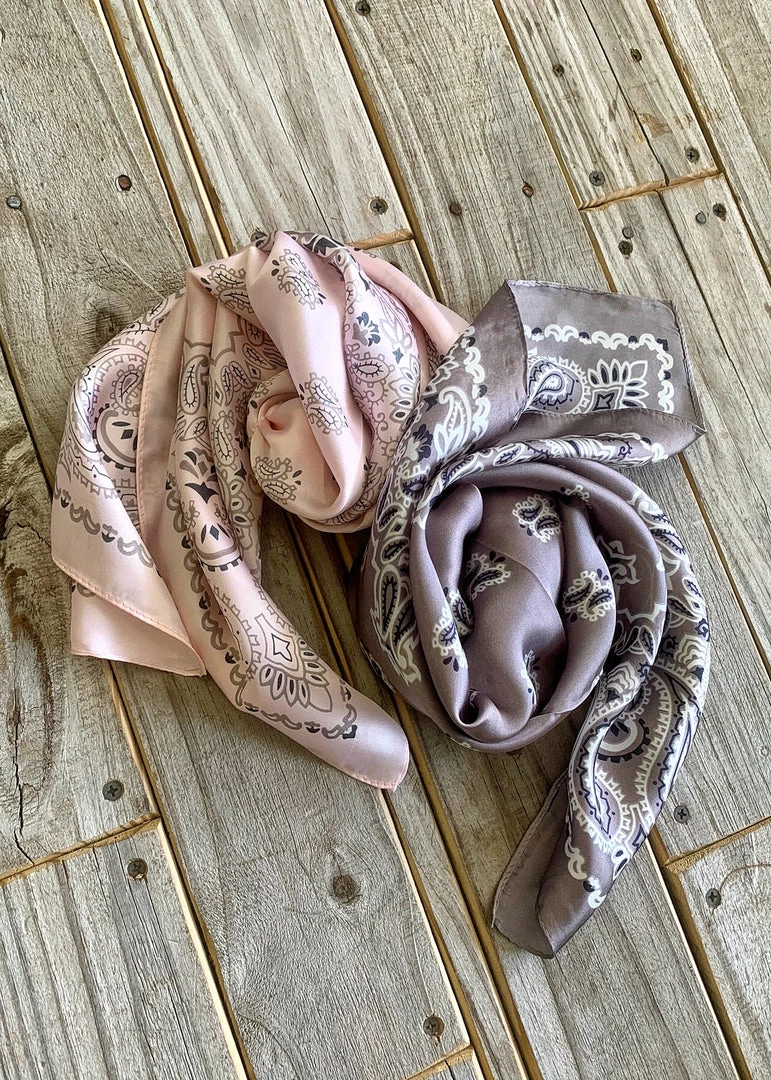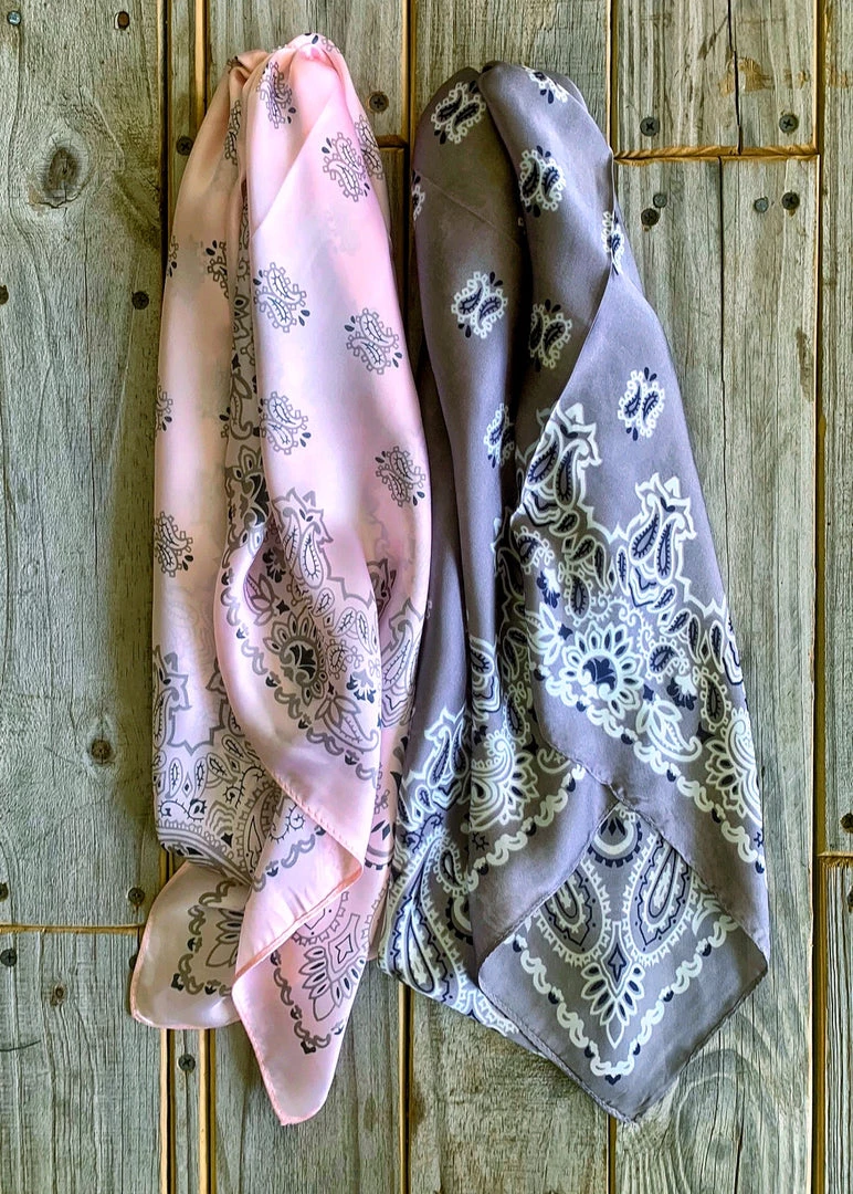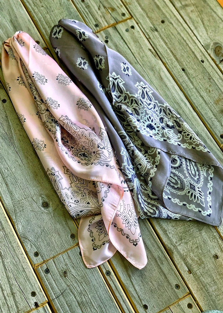 Silver colored silk bandana is the perfect accessory. Tie it around your wrist, belt loop, in your hair, or wear it as a western wild rag around your neck. SO many different CUTE ways to incorporate this babe in your outfits. Stand out with our new bandana! Pair with our Fayetteville Jumpsuits for the complete look!