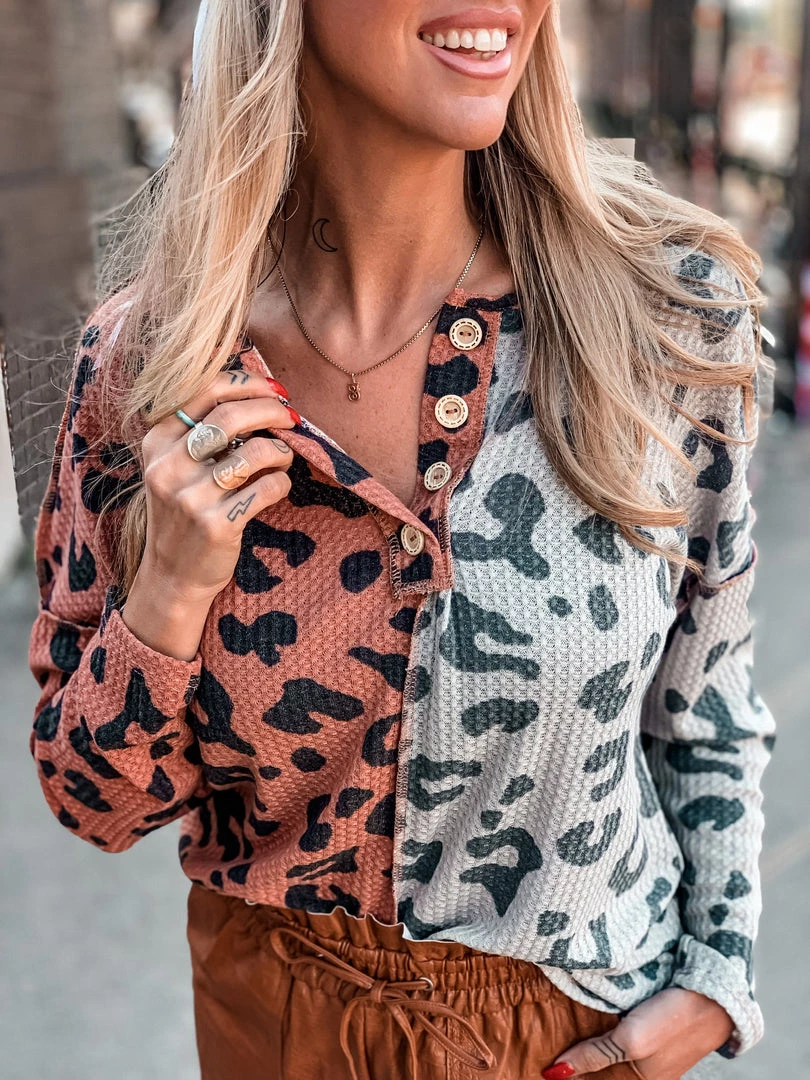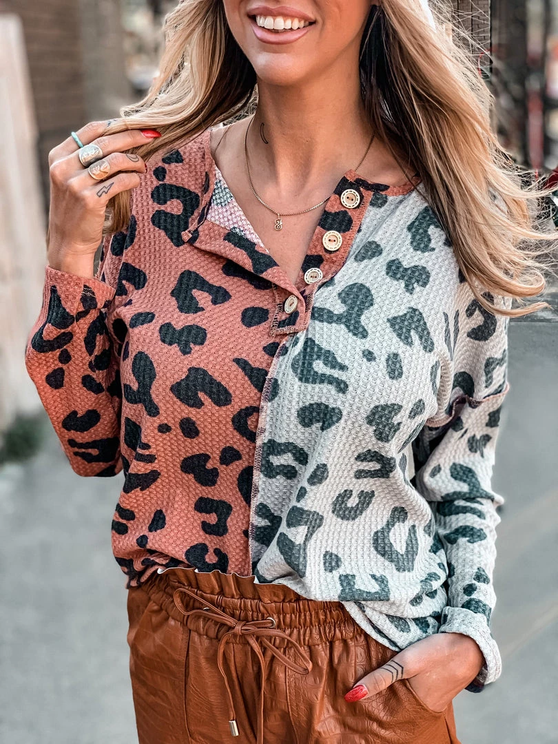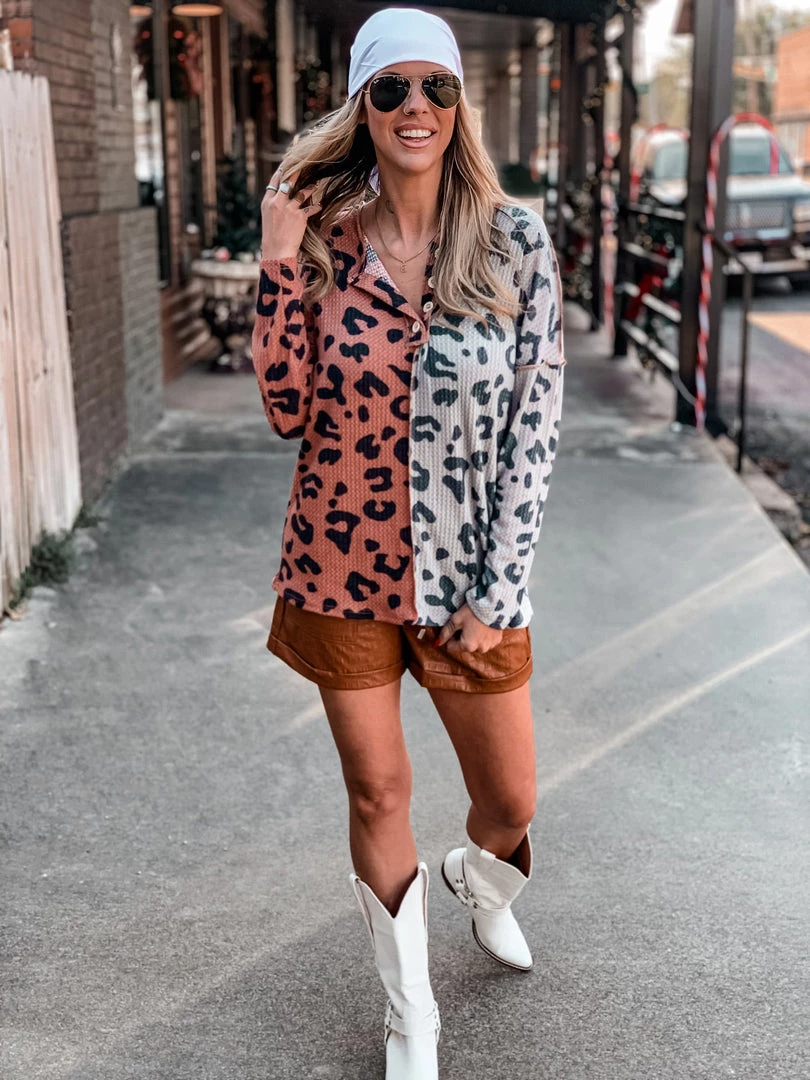 Rust and taupe gray leopard print color block top is the perfect addition into your wardrobe. Features a half rust half taupe gray leopard print pattern, faux buttton down v-neckline, waffle knit material, long sleeves, and a cute fit. Pair with our Louise Shorts in Camel or your favorite denim, our Celeste Boots, and our Wild Rag Head Scarfs!