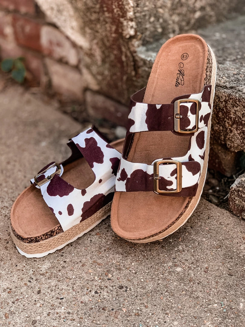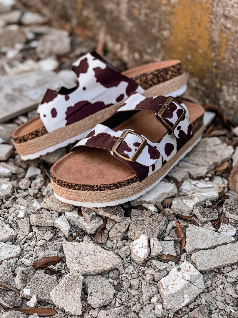 - This Summer’s must have brown and white cow print platform sandals