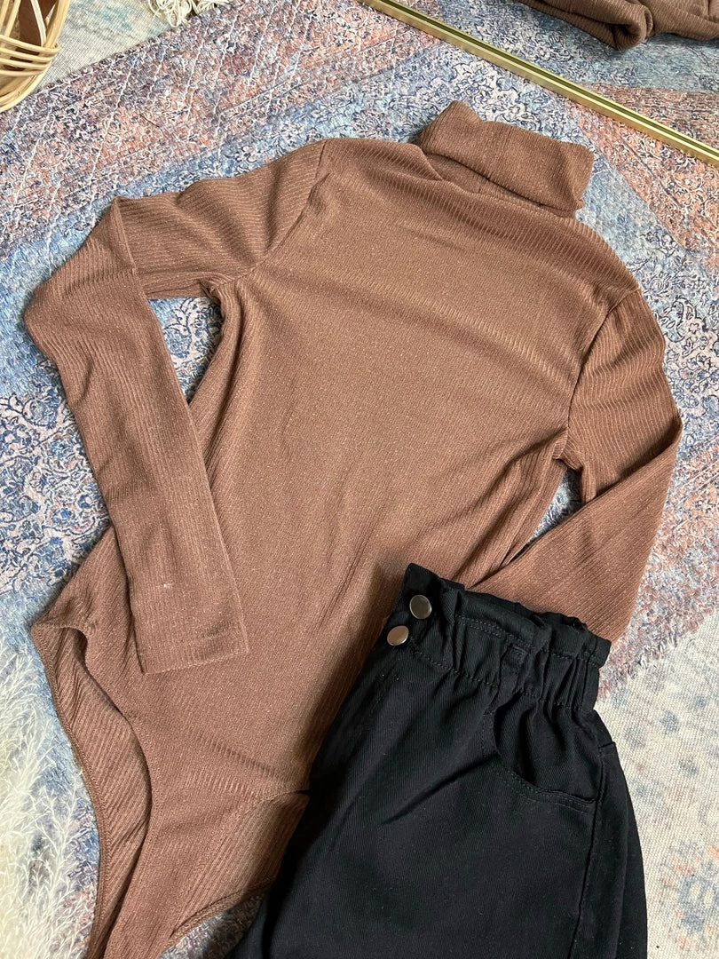 - Cute chic mocha ribbed knit turtleneck long sleeve bodysuit