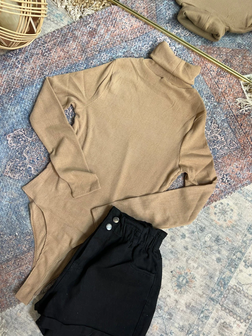 - Cute chic camel tan ribbed knit turtleneck long sleeve bodysuit