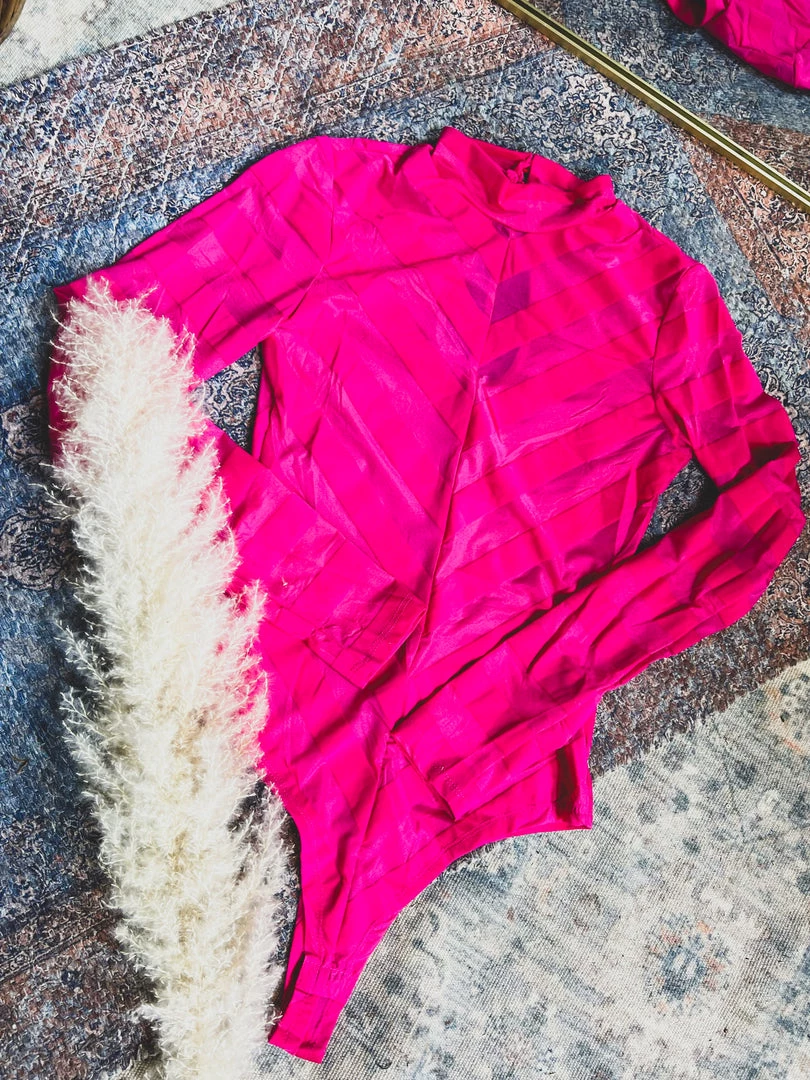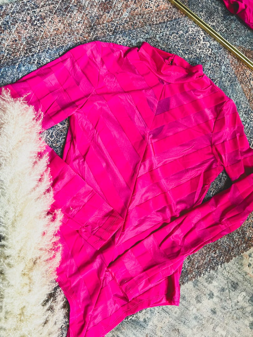 - Hot pink striped bodysuit, sheer mesh fabric, mock neck with button closure, long sleeves, traditional bodysuit button snap closure