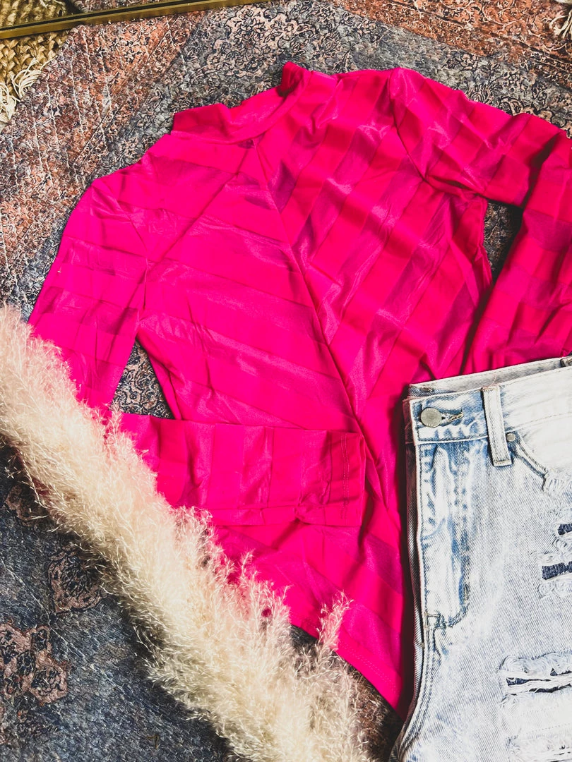 - Show stopping neon pink sheer mesh striped bodysuitÂ