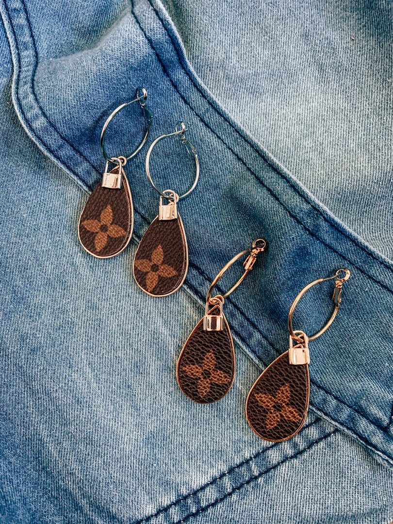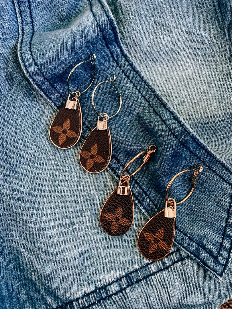 Lock charm earrings on a hoop. Earrings feature a lock charm and a genuine leather teardrop shape charm on a hoop.