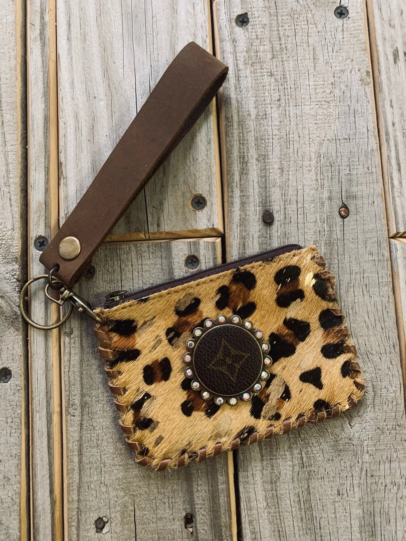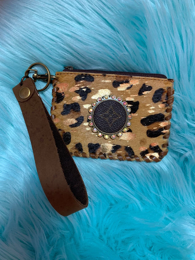 Beautiful genuine leopard print cowhide with gold acid wash coin purse wristlet. Wristlet features zipper top closure, brown leather wristlet, and brown leather stitching. Such a cute wallet!
