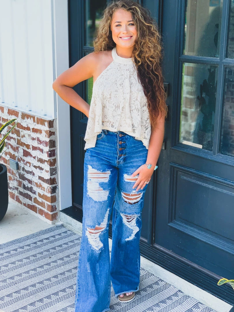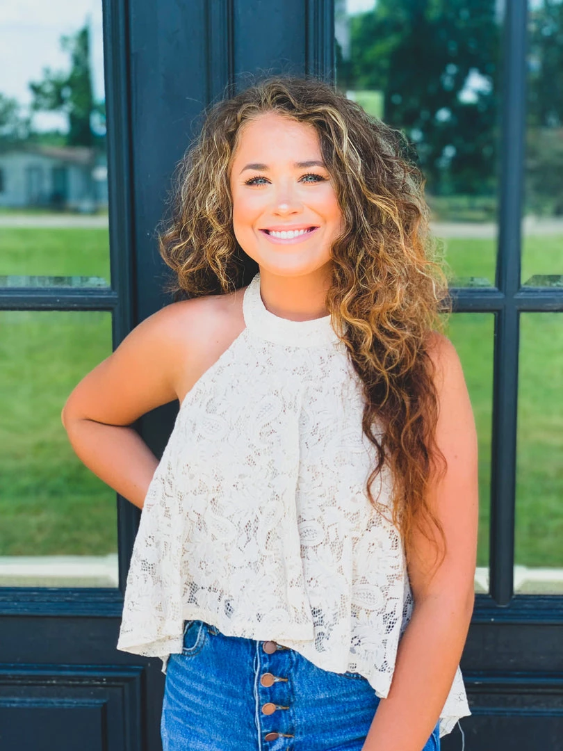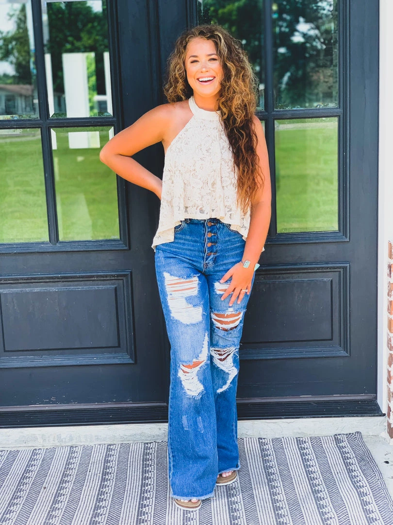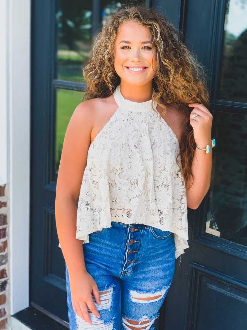 Beautiful lace embroidered taupe top is the perfect top for any and all occasions. Top features a halter style, a button closure neck, side zipper for closure and easy slip on, and a high low style with an open back – the front has a cropped length with a longer back. Top features two layers of lace fabric, the underneath lace layer is a shorter length but provides extra coverage. Perfect to pair with our Winnsboro Pants and our Flowella Studs!
