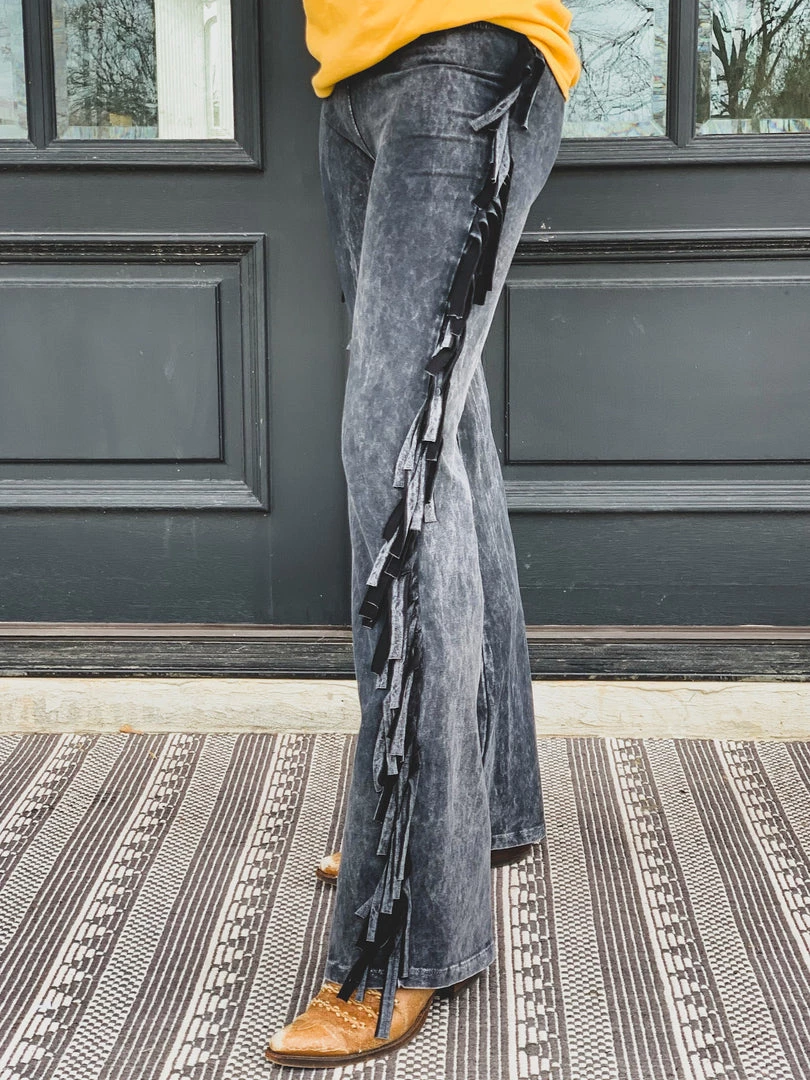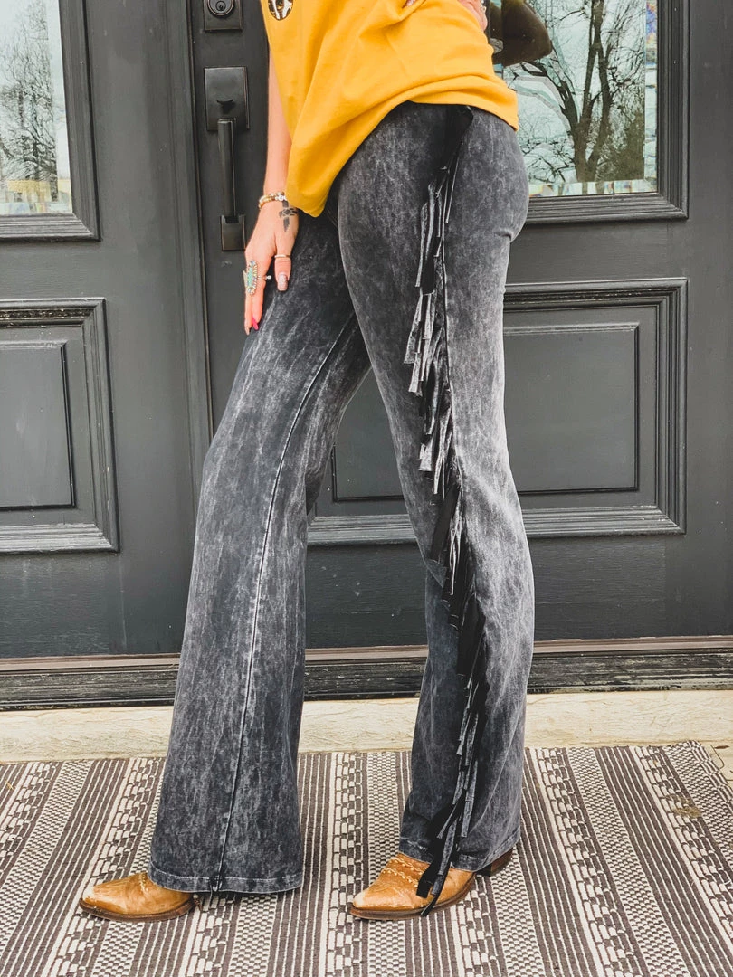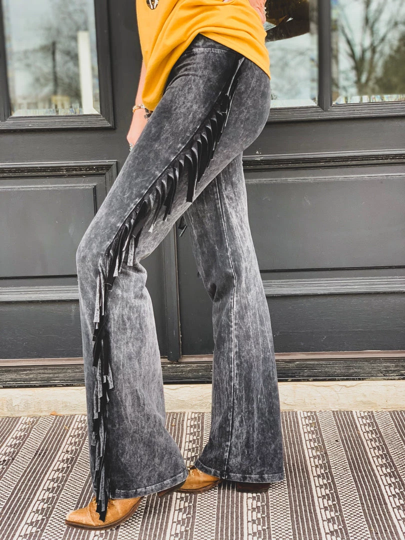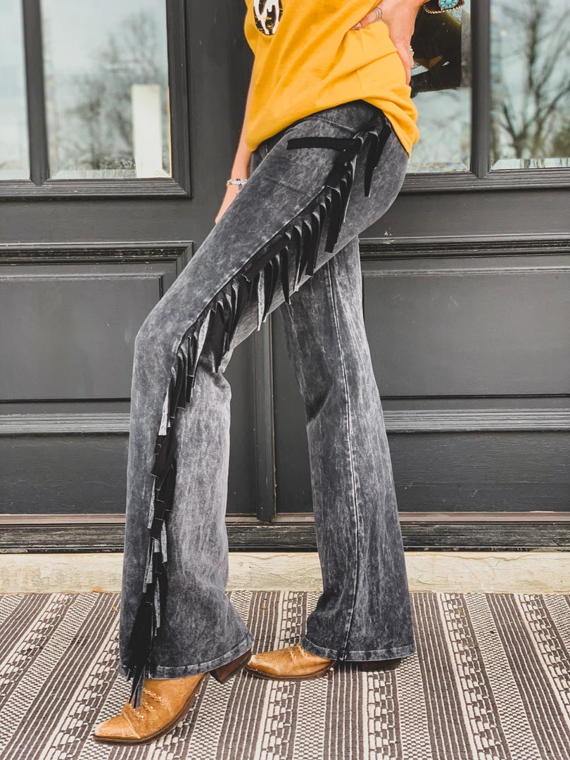 Fitted flare super soft black western inspired fringe yoga pant style bell bottoms. Features fringe detail down the side of each leg. Elastic waistband with LOTS of stretch. Have a spanx like hold!Â