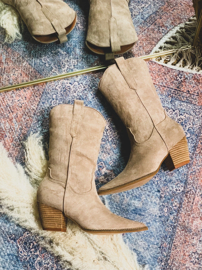 - Taupe suede western style boot with a mid-calf height, arched cuff with double pull tabs, and a stacked heel.
