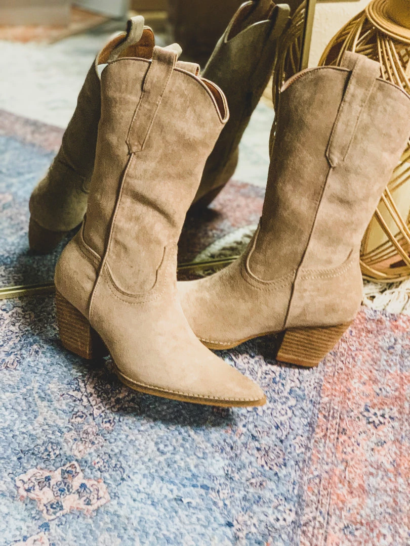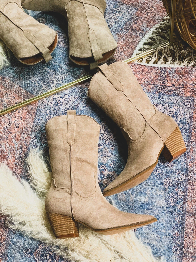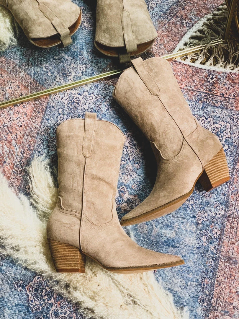 Beautiful taupe suede western style boots are all we can talk about! Features a mid-calf height, arched cuff with double pull tabs, zipper closure for easy pull on, stacked heel, and an almond toe. Hurry! These must have cuties will go FAST!