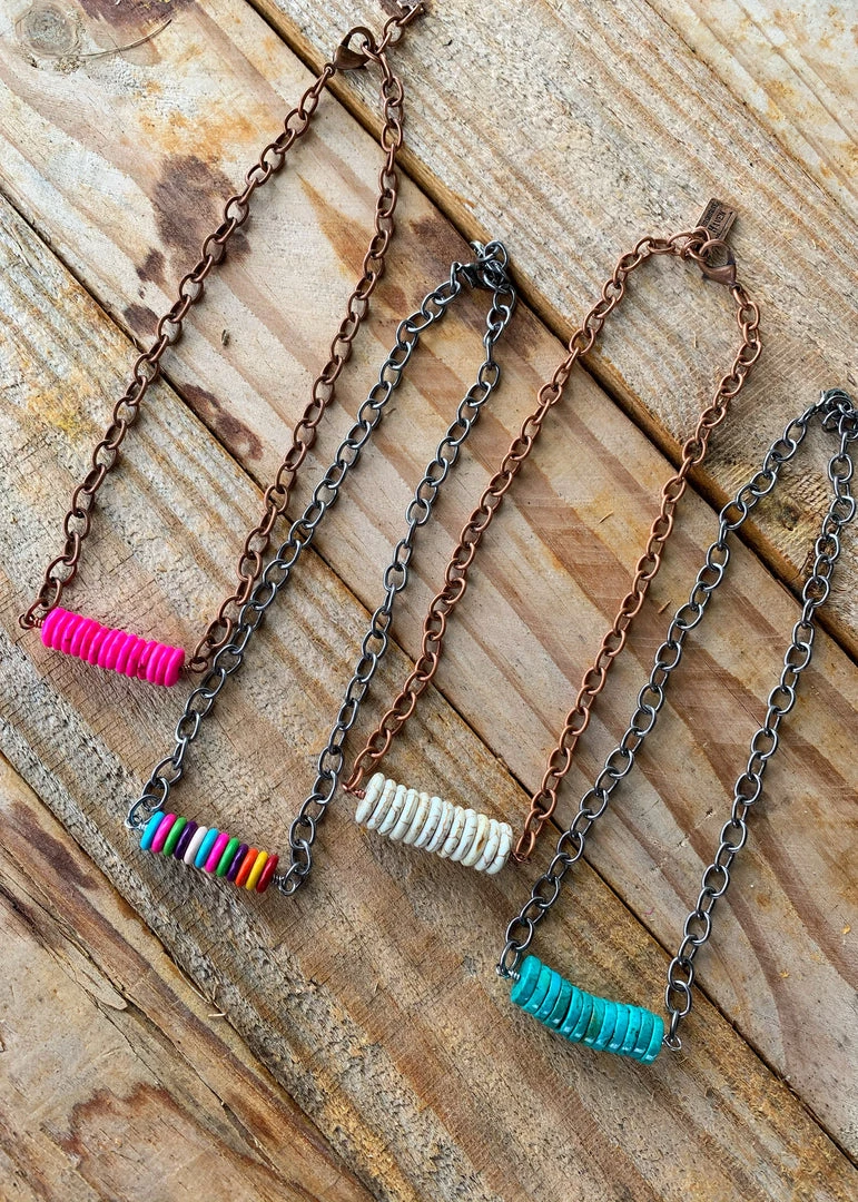 Choose between silver chain with turquoise or multi color stone beads or copper chain with ivory or pink color stone beads.