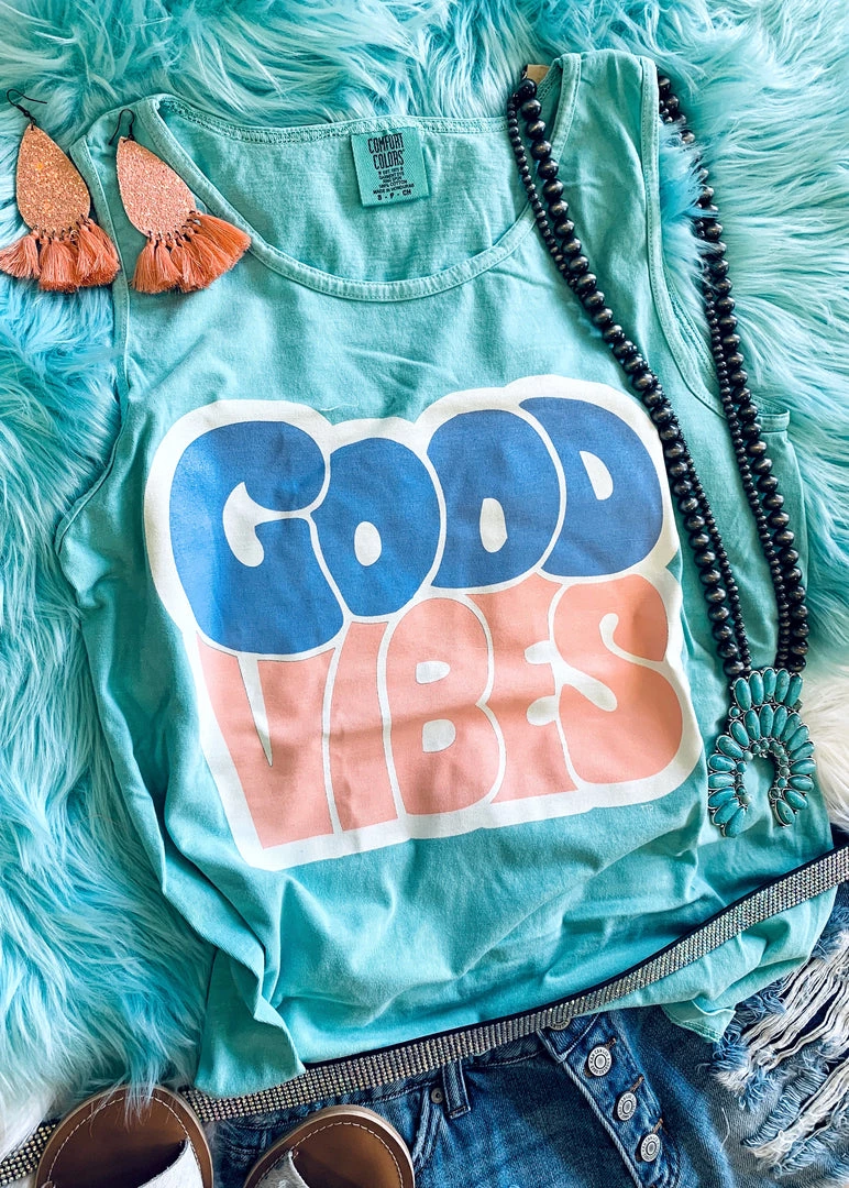 Mint turquoise comfort colors tank top with the retro quote, “GOOD VIBES”. Colors are pastel and the lettering is so retro we are OBSESSED.