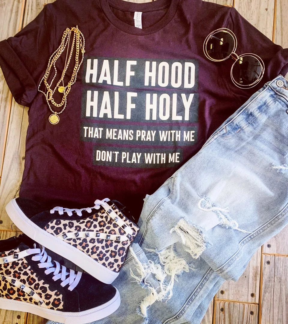 Maroon bella canvas graphic tee with the funny quote, “Half Hood Half Holy That Means Pray With Me Don’t Play With Me.” If this isn’t the exact TRUTH! Are we right or are we right!? Graphic tee is a unisex fit and looks so cute with all your denim.
