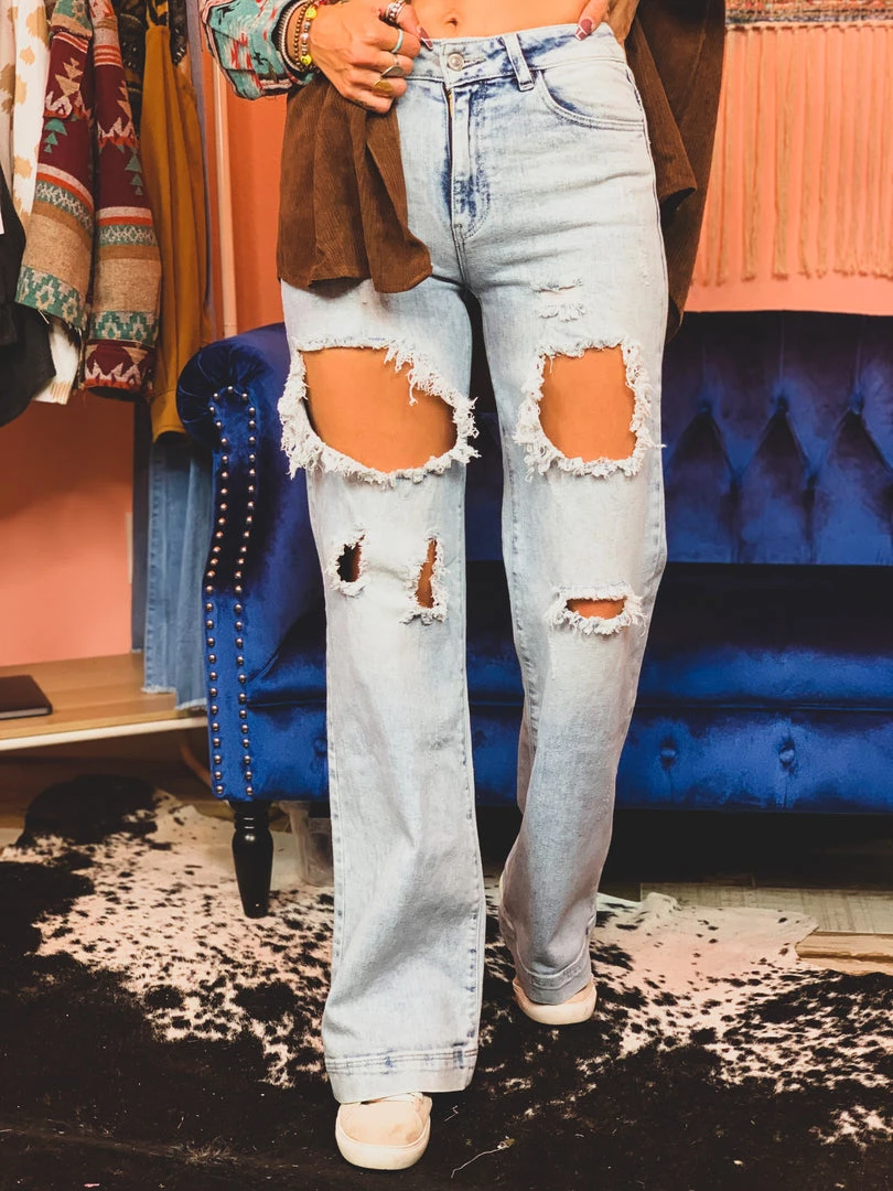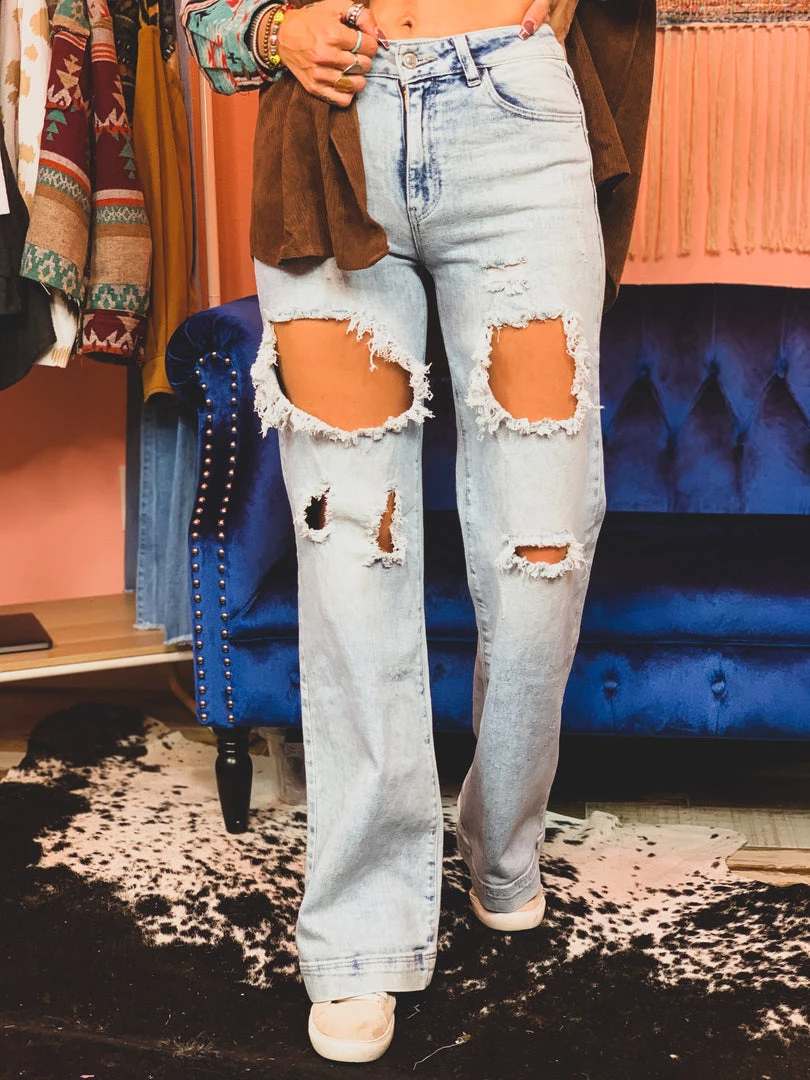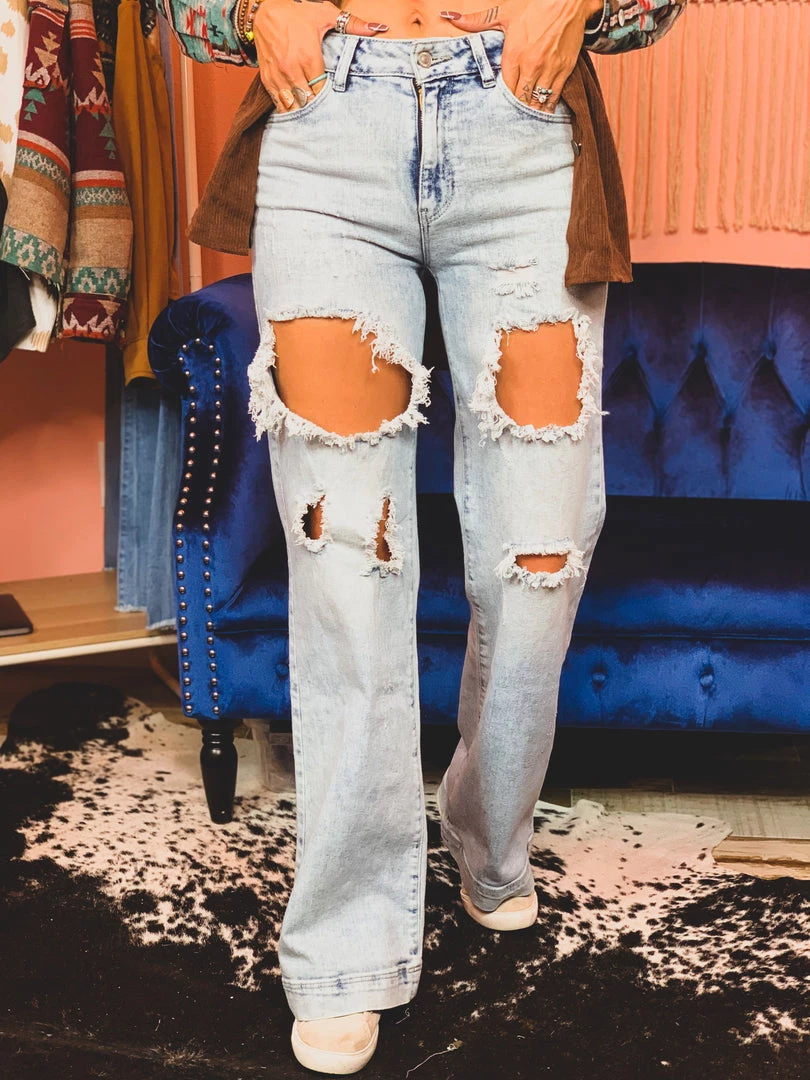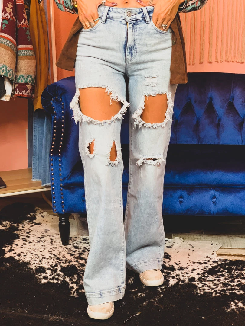 Gypsy Waltz is SO OBSESSED! Distressed vintage fully acid washed wide leg flare trouser pants are a MUST HAVE in your closet. Jeans have a traditional front button and zipper closure and two back pockets. Jeans have distressing, completely vintage acid wash, wide leg pants are perfect for any occasion.Â