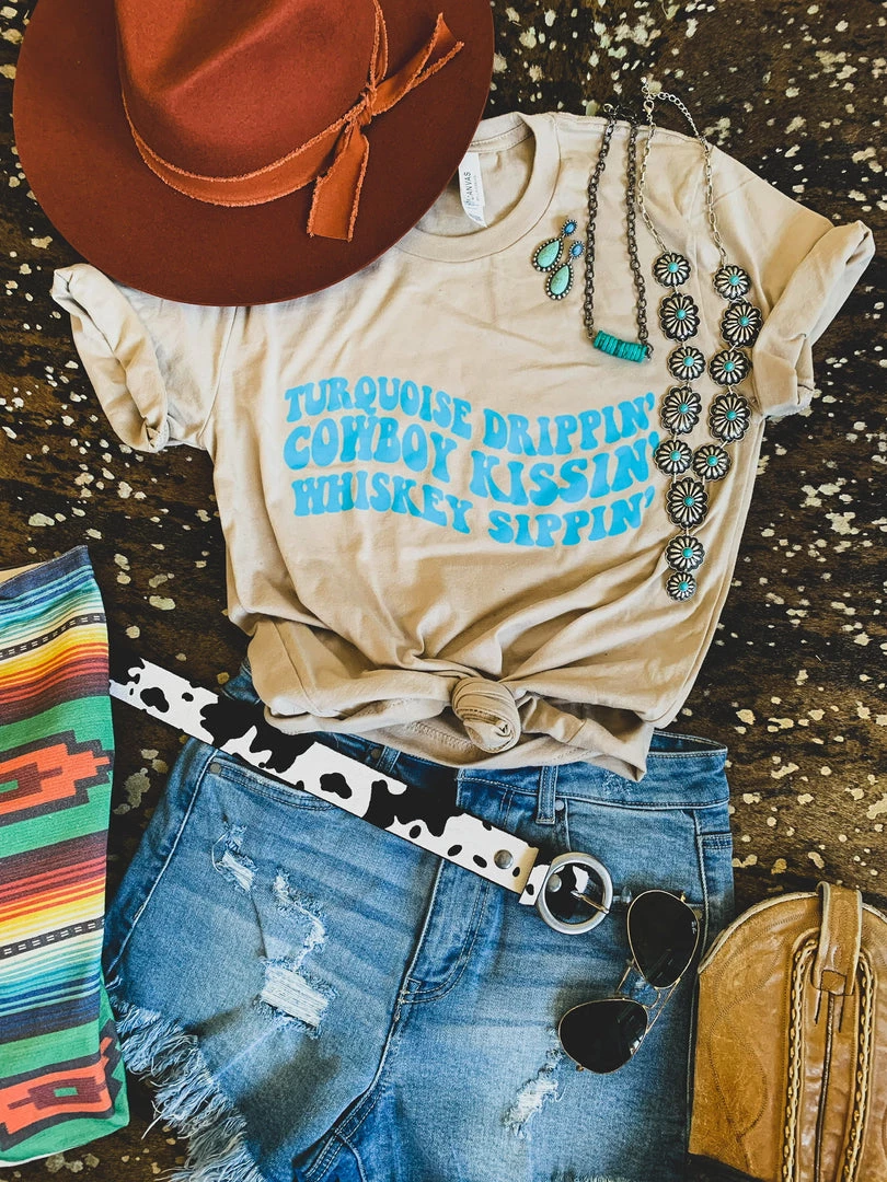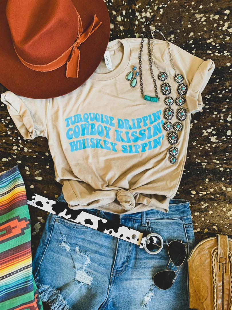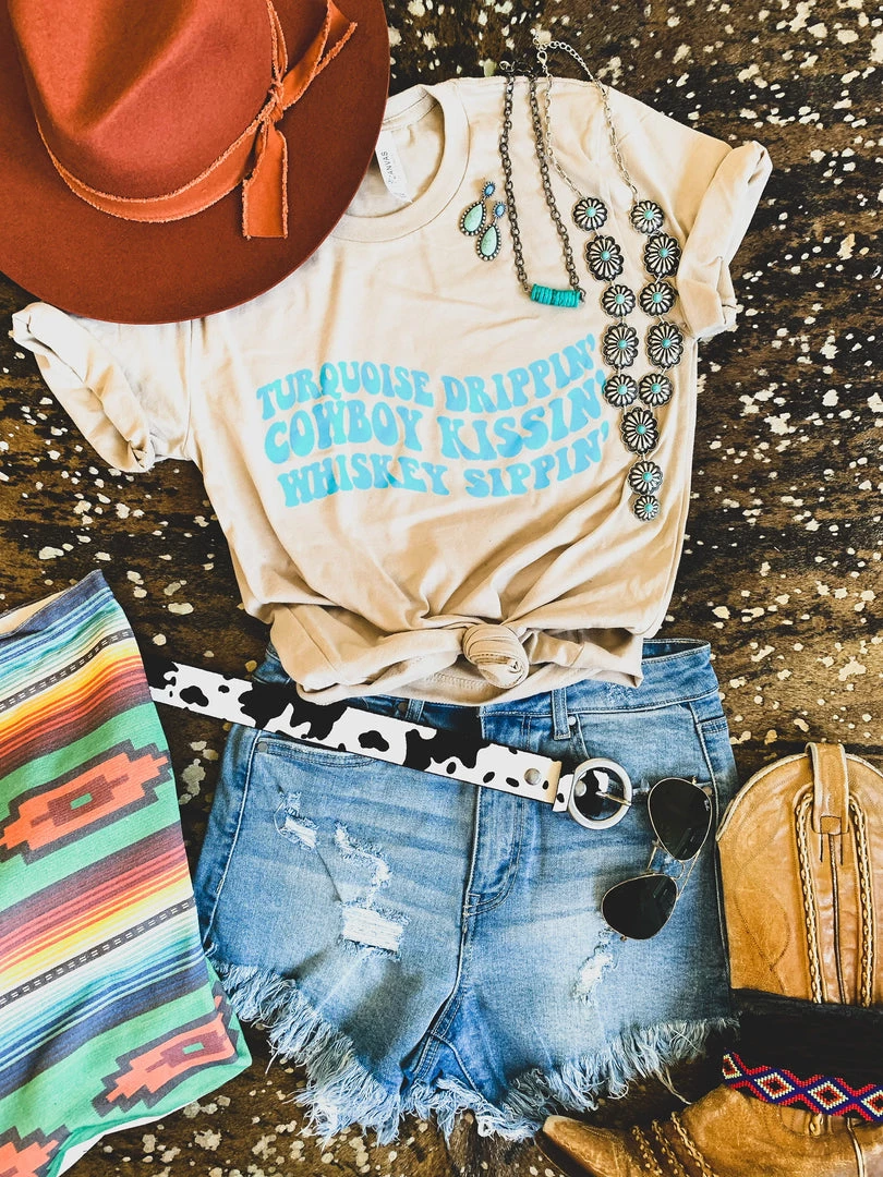 Sand colored graphic tee with the turquoise quote, “Turquoise drippin’ cowboy kissin’ whiskey sippin’.” Ugh, if this isn’t the CUTEST tee ever! For all our turquoise loving, cowboy kissin’ and whiskey sippin’ gals. Perfect pair with your favorite black denim shorts!
