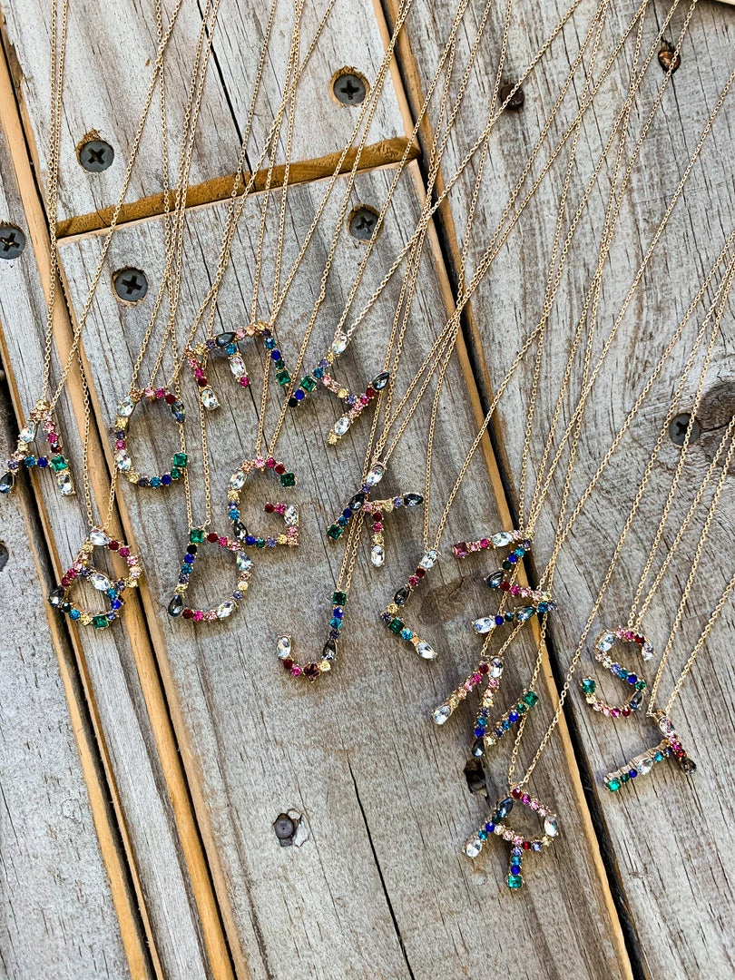 Colorful rhinestoned initial necklace is the perfect necklace! Snag one for you, your besties, family, THE perfect sweet gift! Necklace is on a gold dainty chain and is super light weight! Colors of the rhinestones and rhinestone pattern placement may vary in each necklace due to the genuine nature.