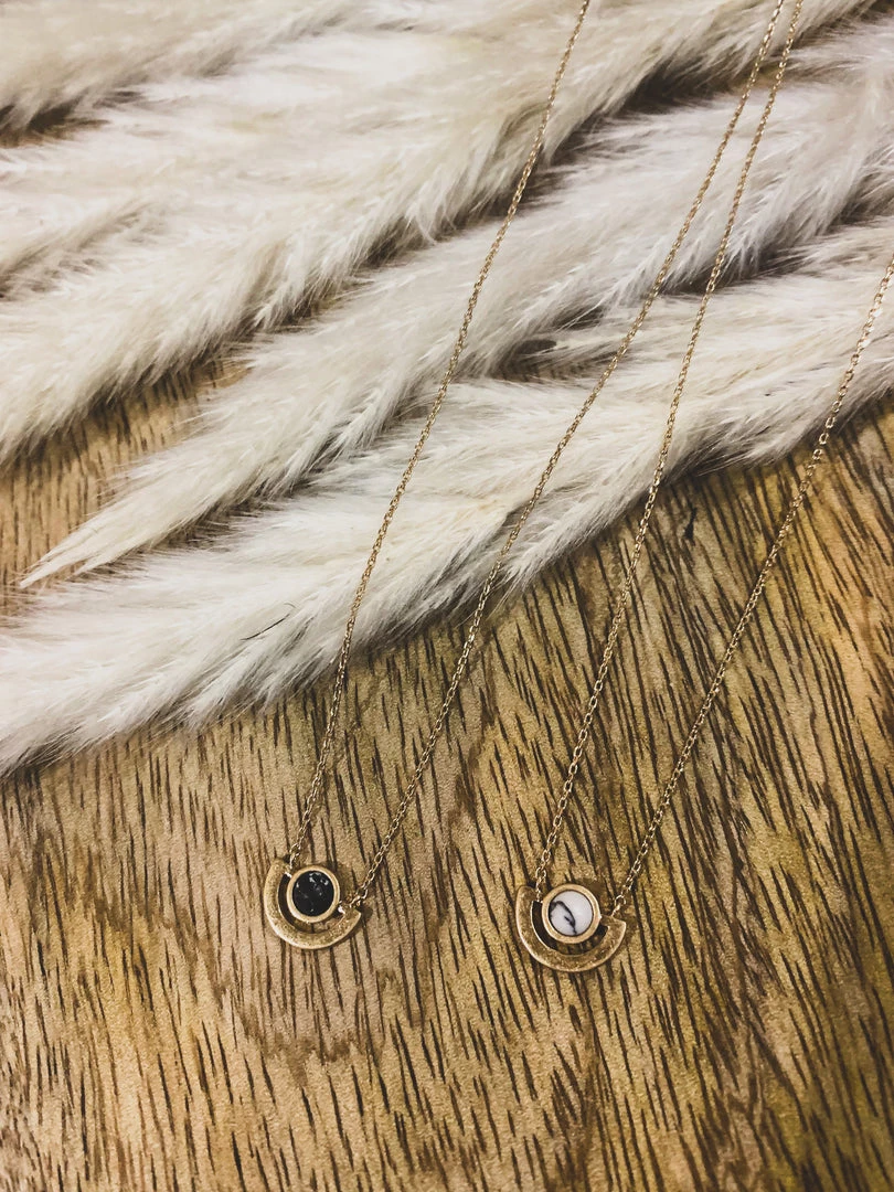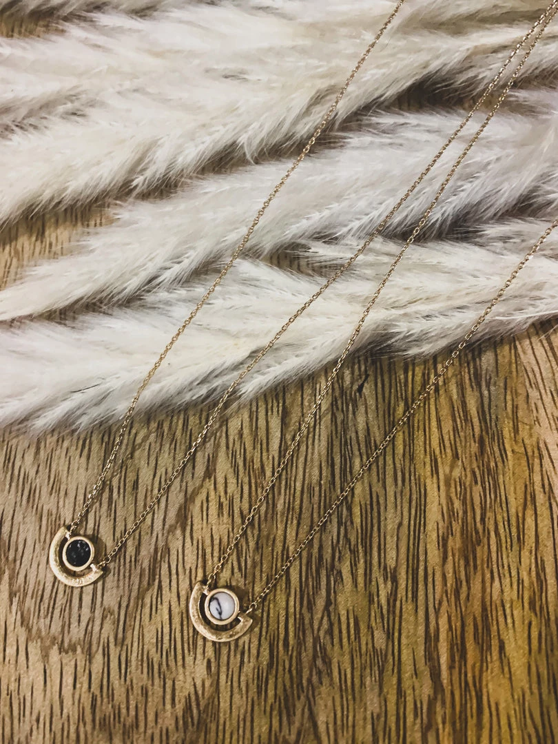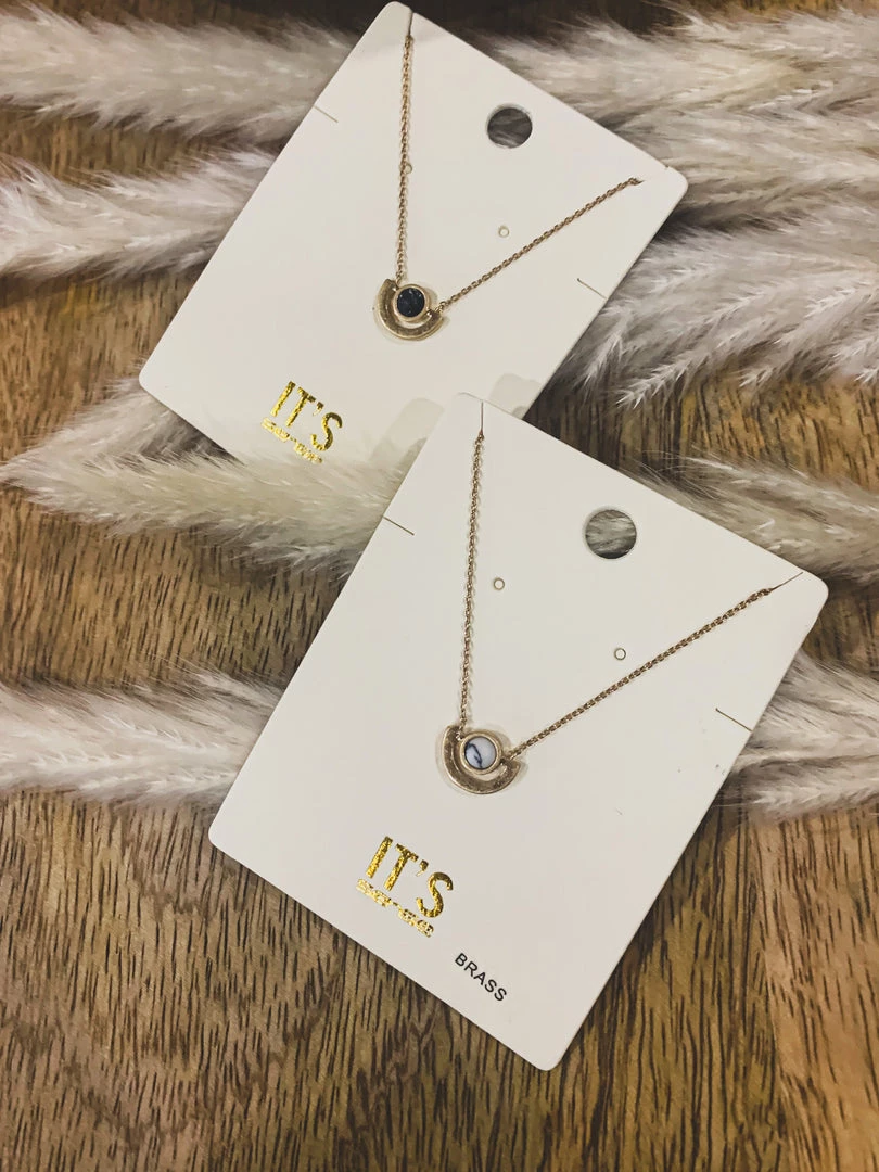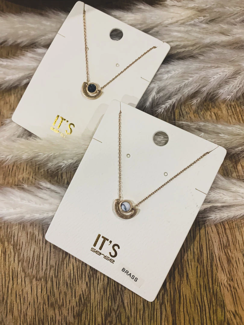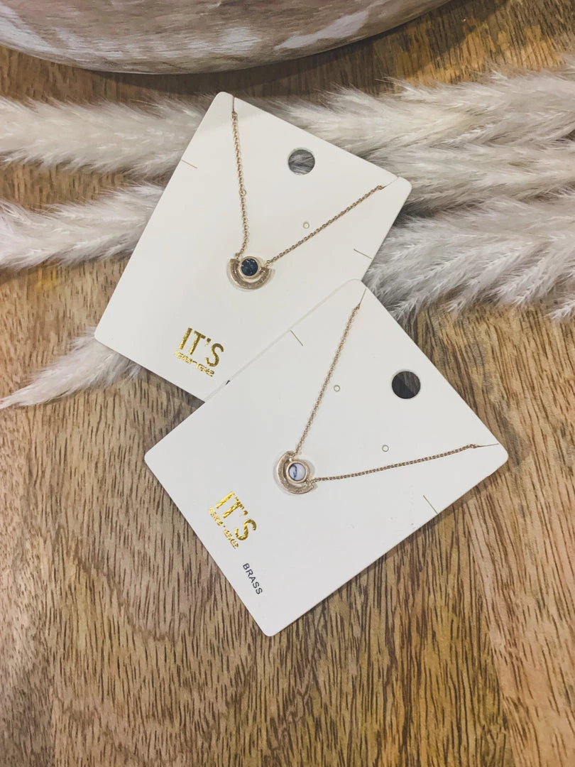 Dainty gold necklace with the cutest round stone. Features a round stone set in a gold half circle setting on a gold dainty chain with lobster clasp closure. Such a cute necklace to layer!Â