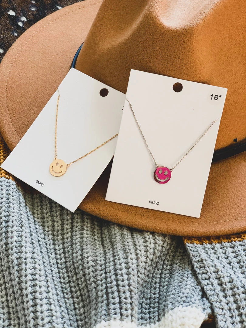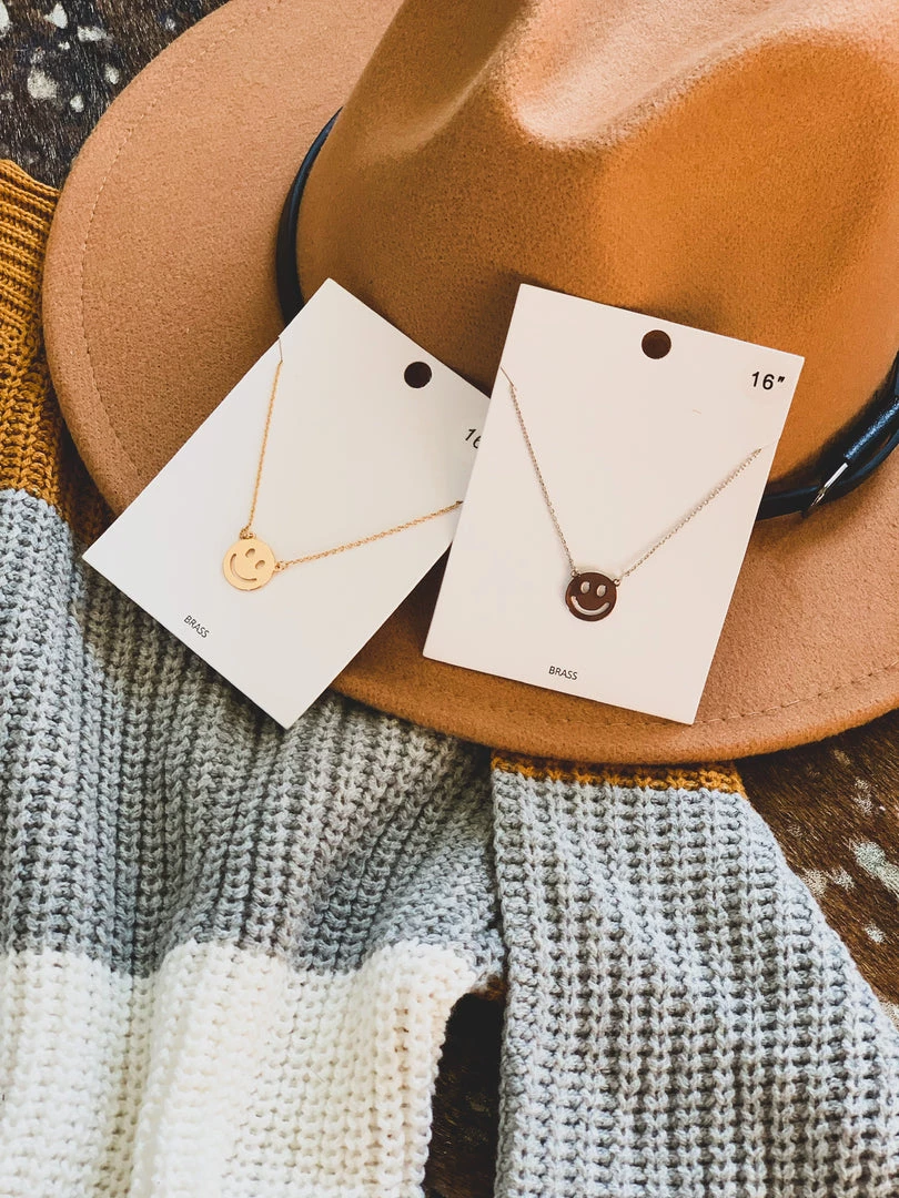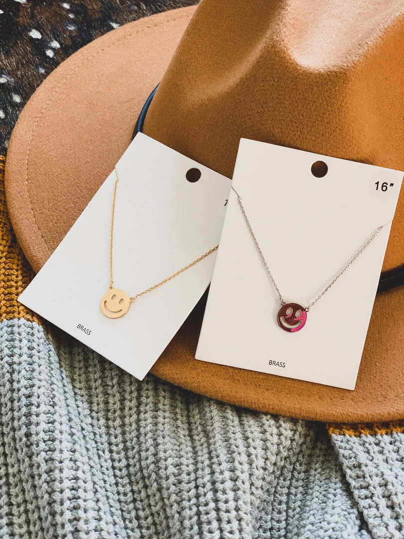 Silver or gold happy Smiley cut out “smiley face” pendent on a silver or gold dainty chain. Necklace is the cutest little accessory piece to spice up your looks. Necklace features a lobster clasp and adjustable links for closure.