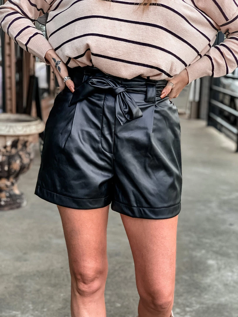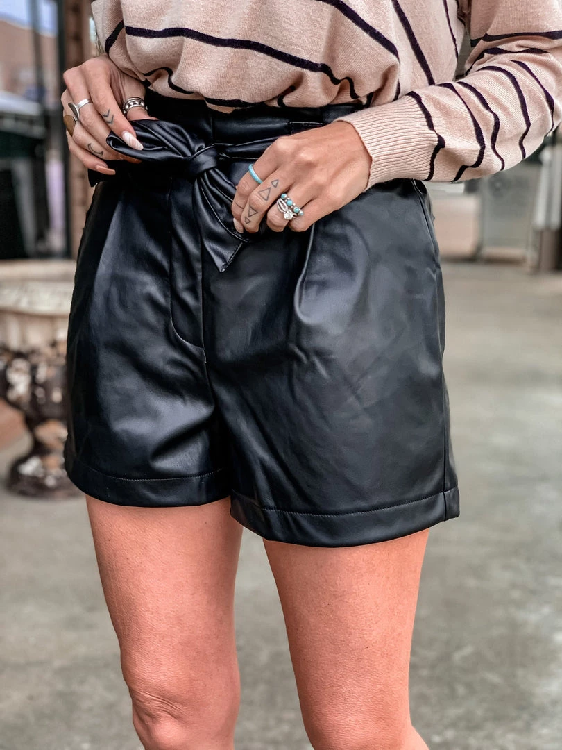 Black faux leather shorts are a year round must have! Shorts are perfect to pair with your graphic tees, body suits, and sweaters. Features a paperbag gathered self tie front waistband with slip on closure, an elastic back waist for easy slip on, drawstring tie waist perfect for adjusting, pockets, and a good length. This season’s must have shorts!