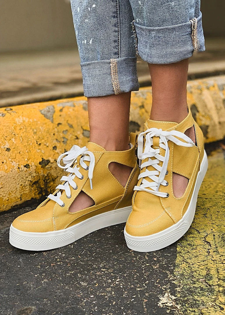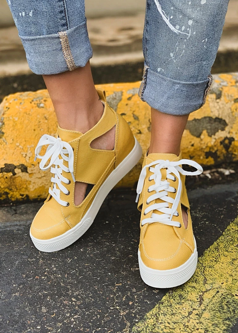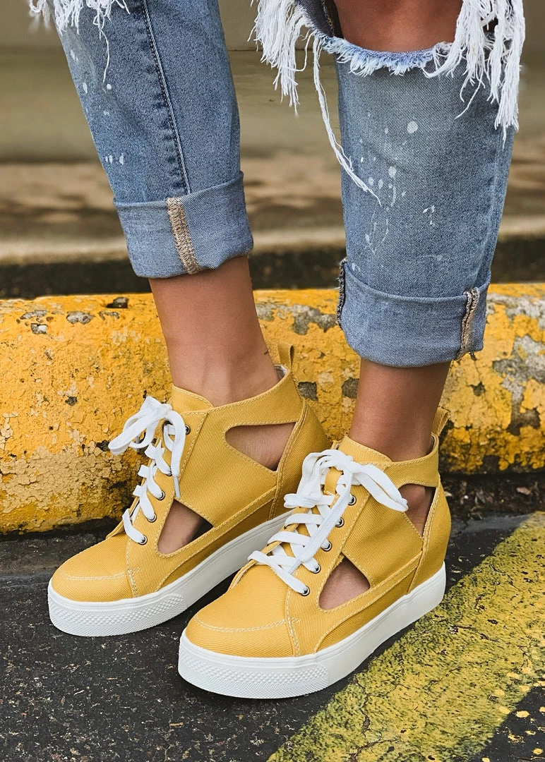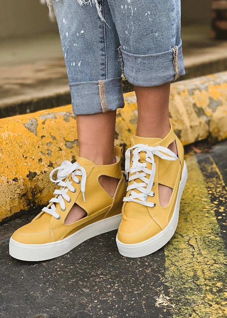 Mustard canvas style platform lace up sneaker has us obsessing. Sneaker features on trend cut out sides, white platform sole, hidden wedge, high top sneaker silhouette and white laces. So retro fabulous! Pair with your favorite distressed denim shorts for Summer.