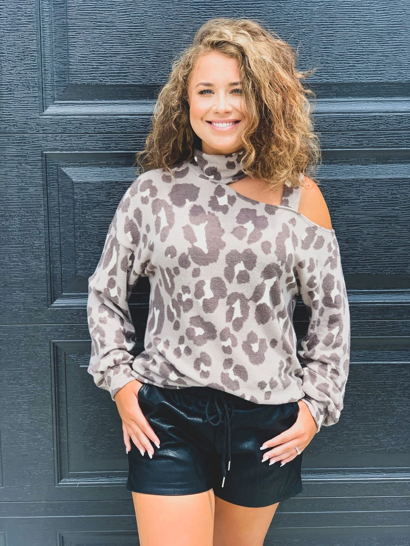 Beautiful buttery soft mocha leopard print top with a cold shoulder, choker style mock neck, and long sleeves. Top is a generous flowy fit and looks perfect paired with all your black distressed denim. Such a perfect go-to top!