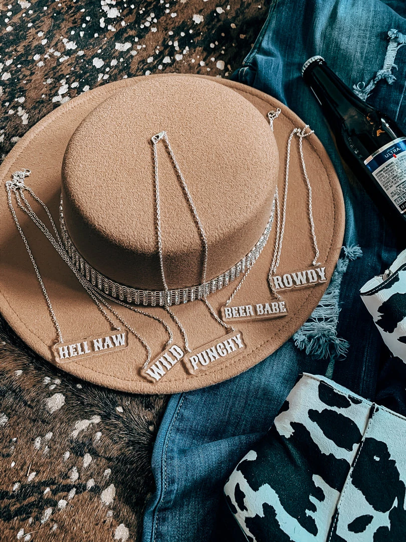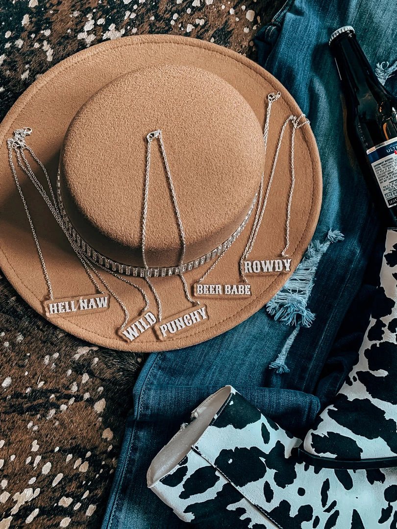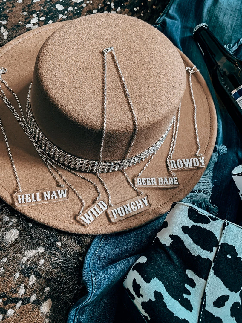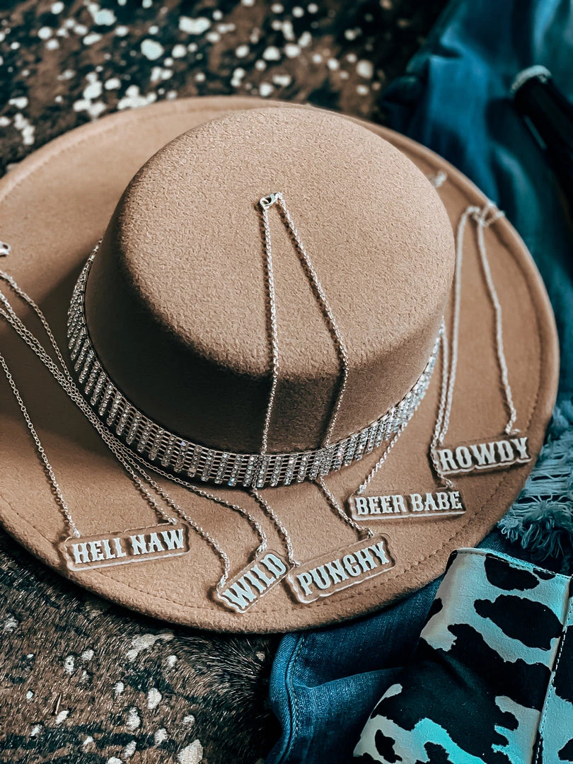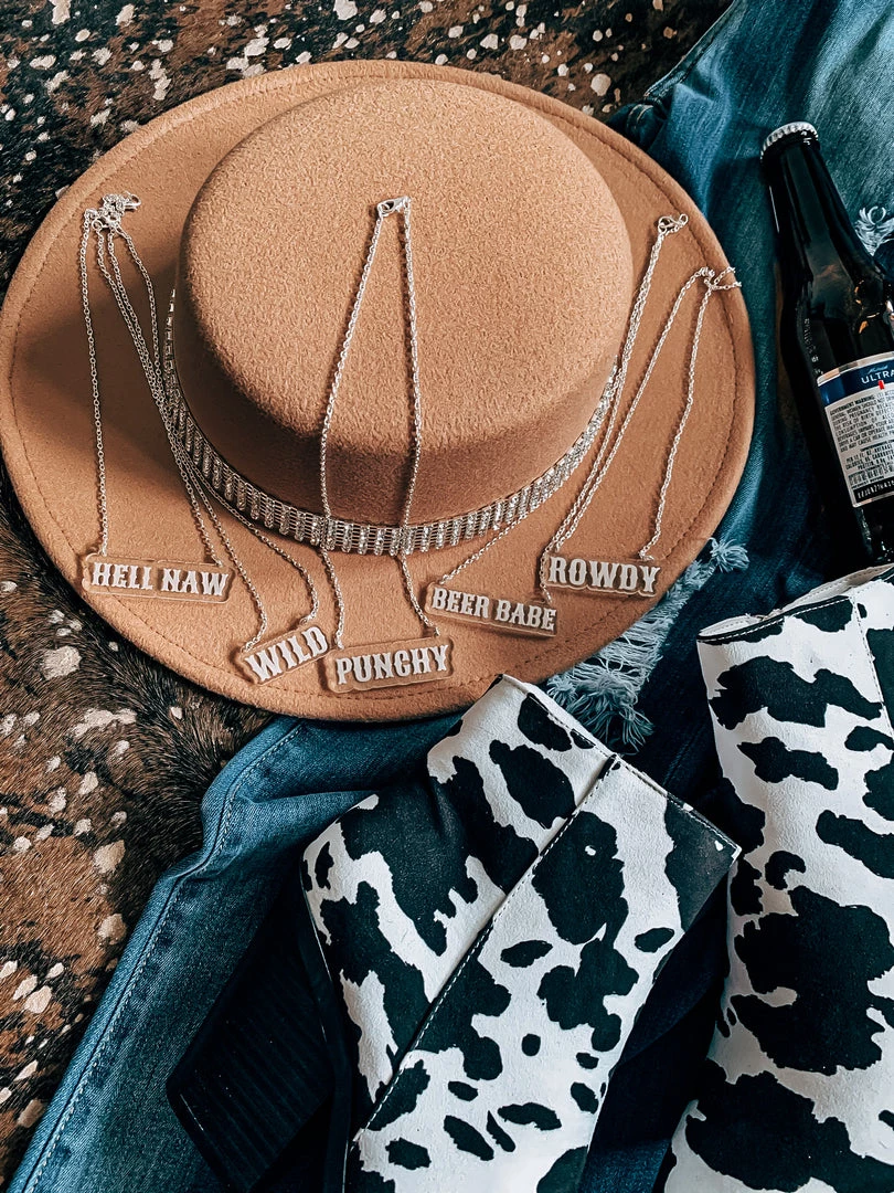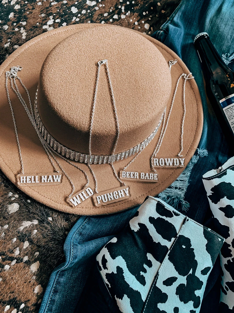 Custom handmade clear acrylic necklaces on a silver chain are a must in your everyday jewelry! Necklaces feature clear acrylic with our signature words “Rowdy”, “Beer Babe”, “Punchy”, “Wild”, or “Hell Naw.” Wording is engraved in white and has a cute western font. Silver chain features a silver lobster clasp with adjustable links. So cute for all our GW babes!