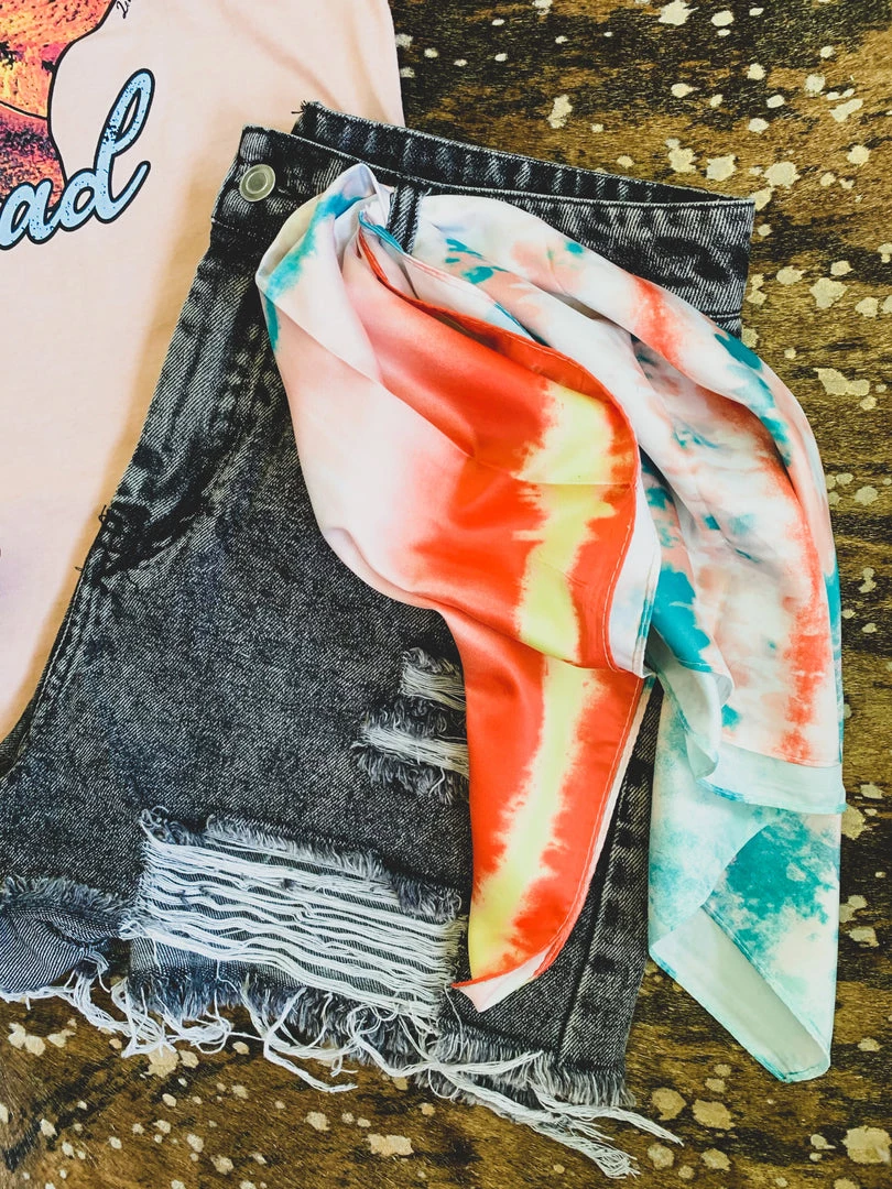 Peach tie dye print silk wild rag is the perfect all around accessory. Tie dye print with a beautiful silky shine. Tie it around your wrist, belt loop, in your hair as a head wrap, or wear it as a western wild rag around your neck. SO many different CUTE ways to incorporate this babe in your outfits. Stand out with our new bandana!