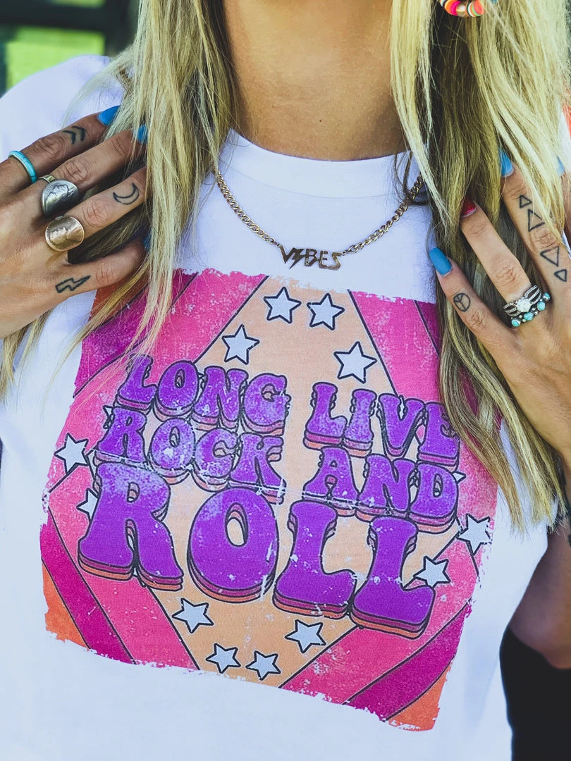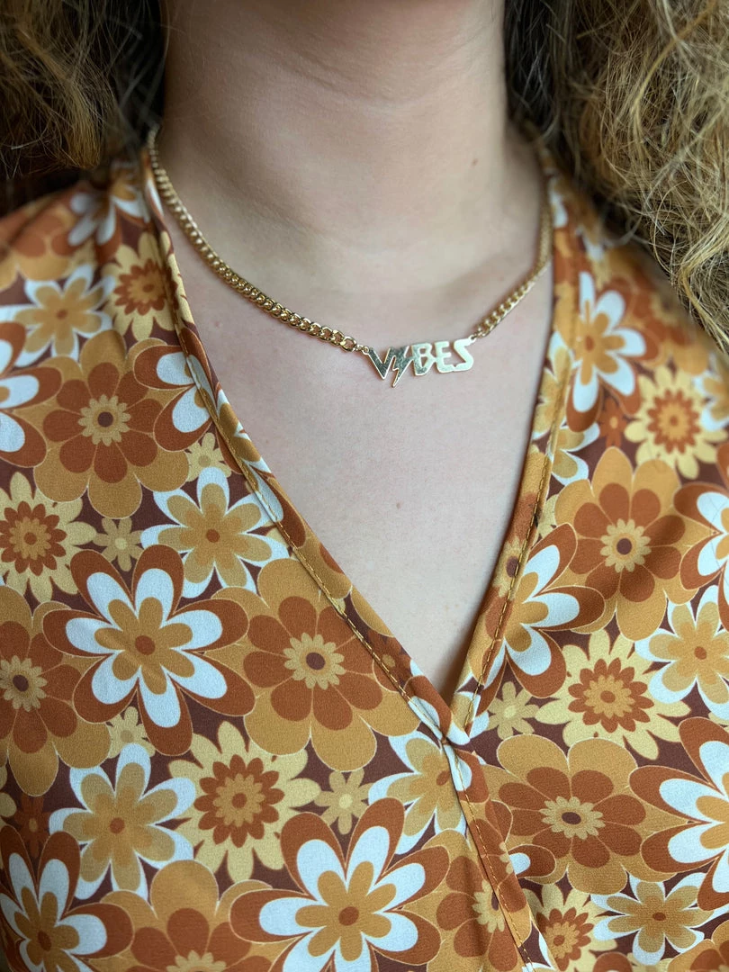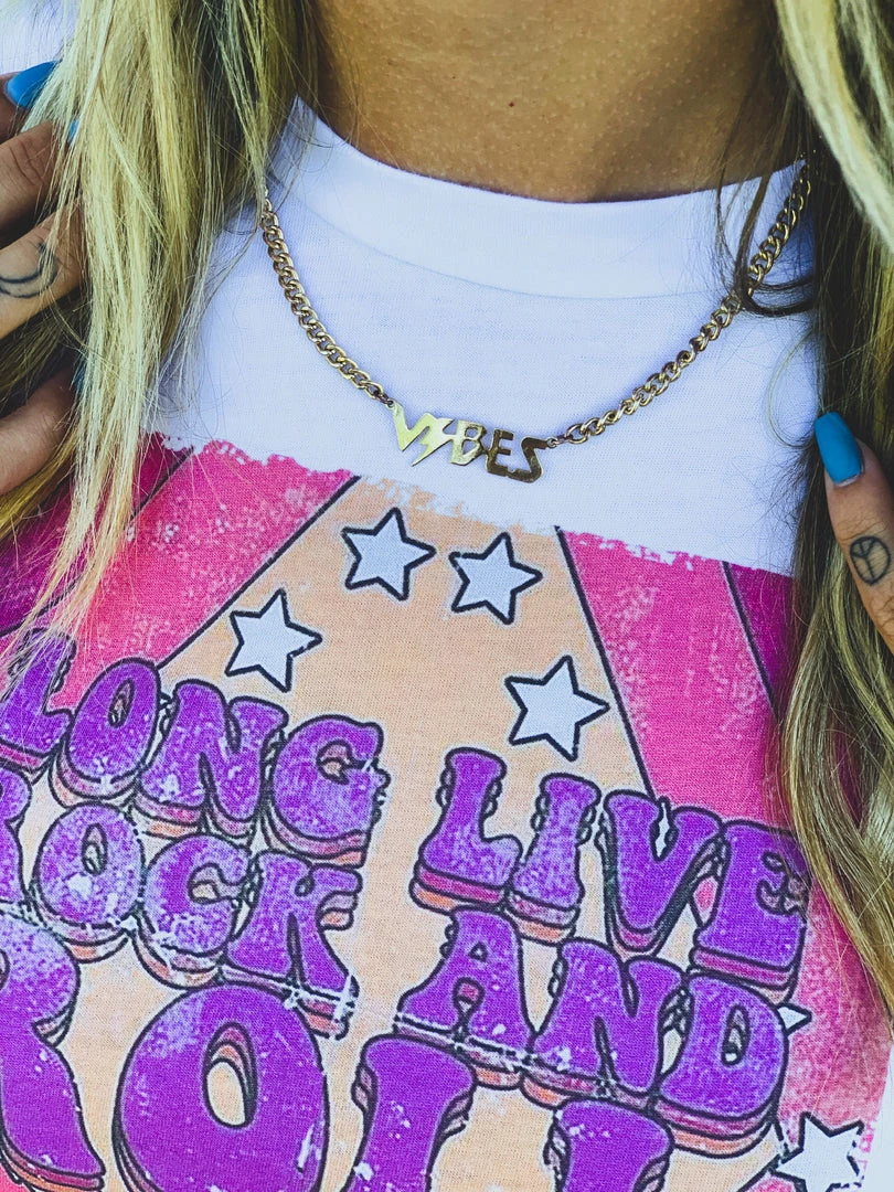 Gold “VIBES” necklace is everything we needed for all our Summer looks! Necklace features the word, “VIBES” with the I being a lightning bolt symbol. Necklace has adjustable links and a gold lobster clasp.
