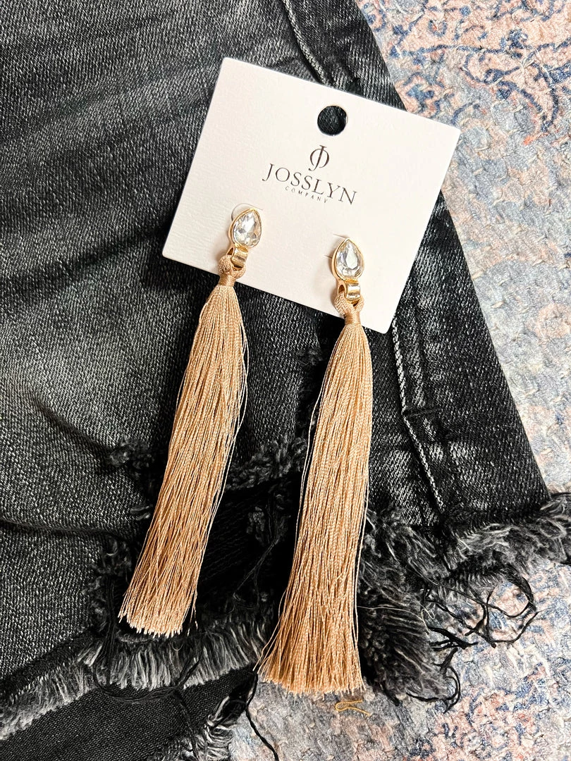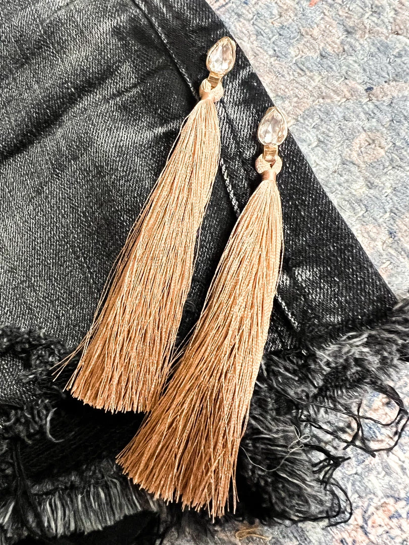 - Stunning boho chic rhinestone earring with long drop tan tassels