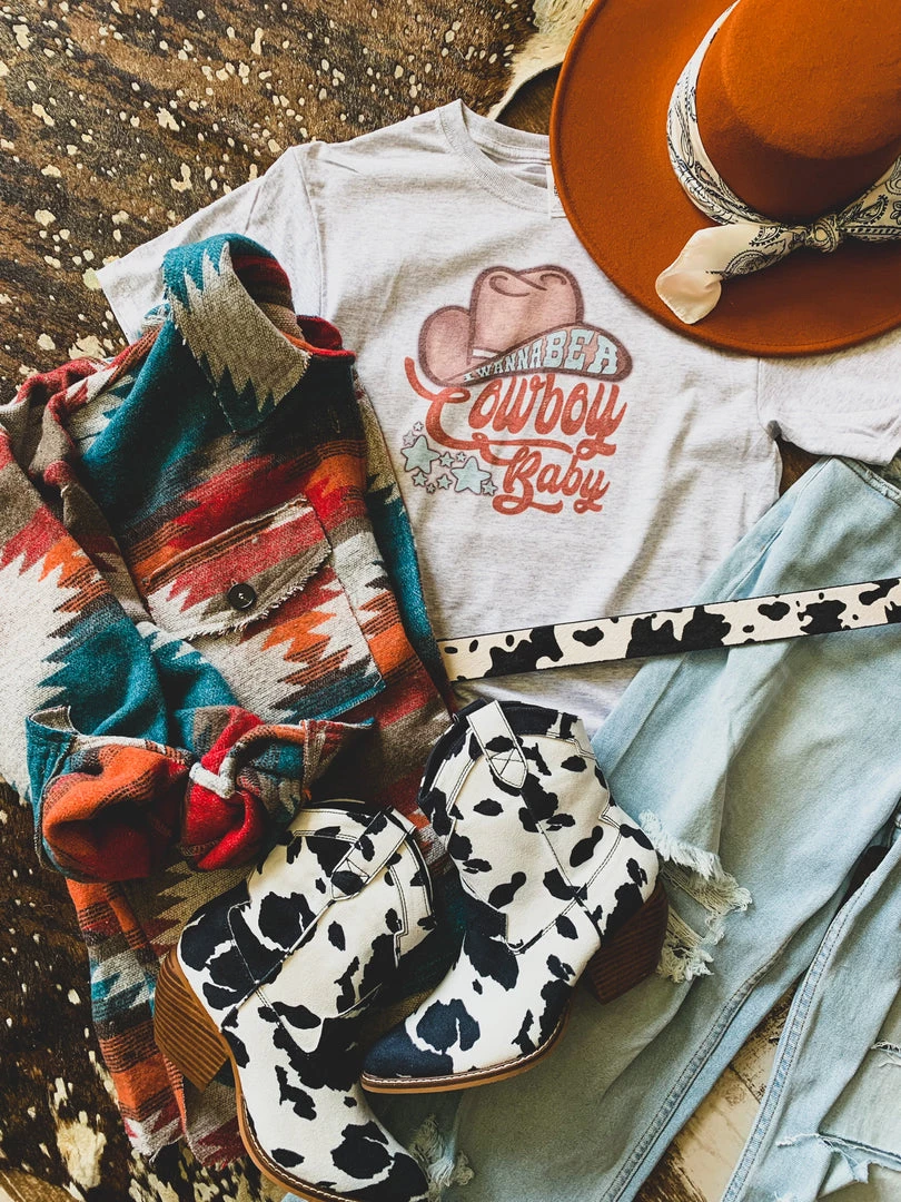 “I Wanna Be a Cowboy Baby” lyric quote on a heathered graphic tee. Features a vintage western graphic of a cowboy hat and stars. Such a cute fun tee with the perfect amount of western flair!