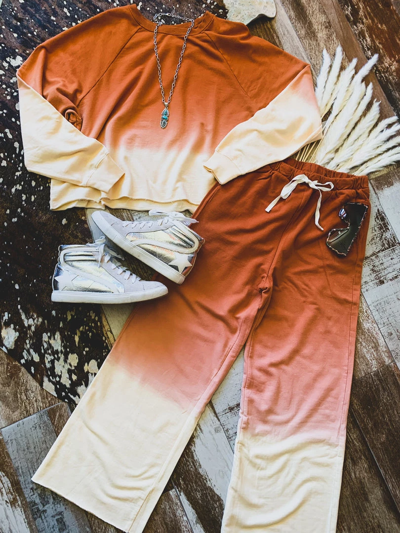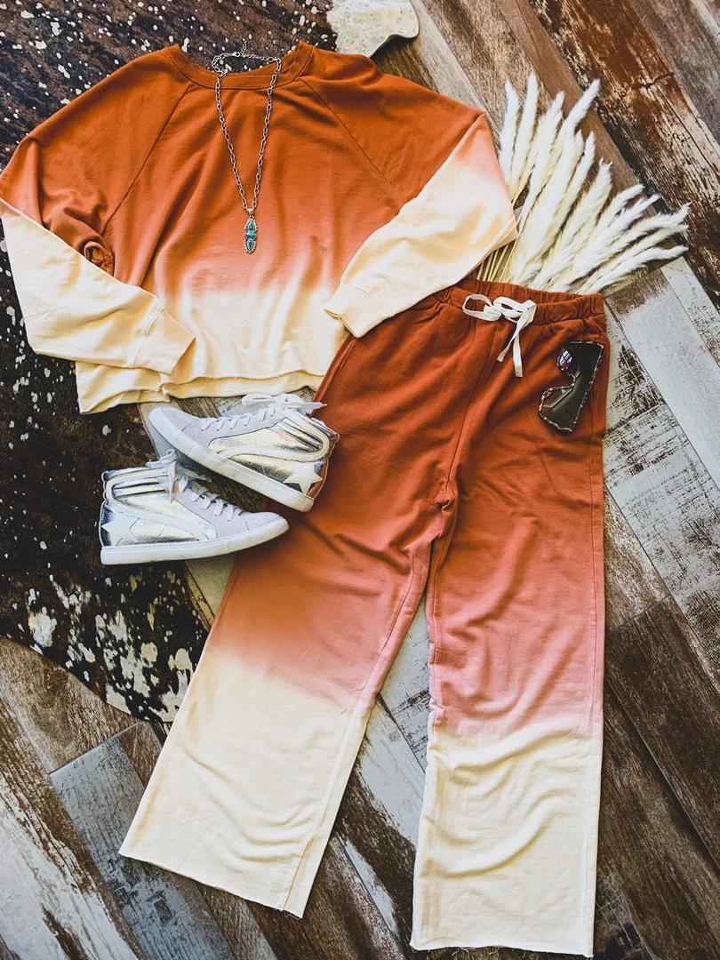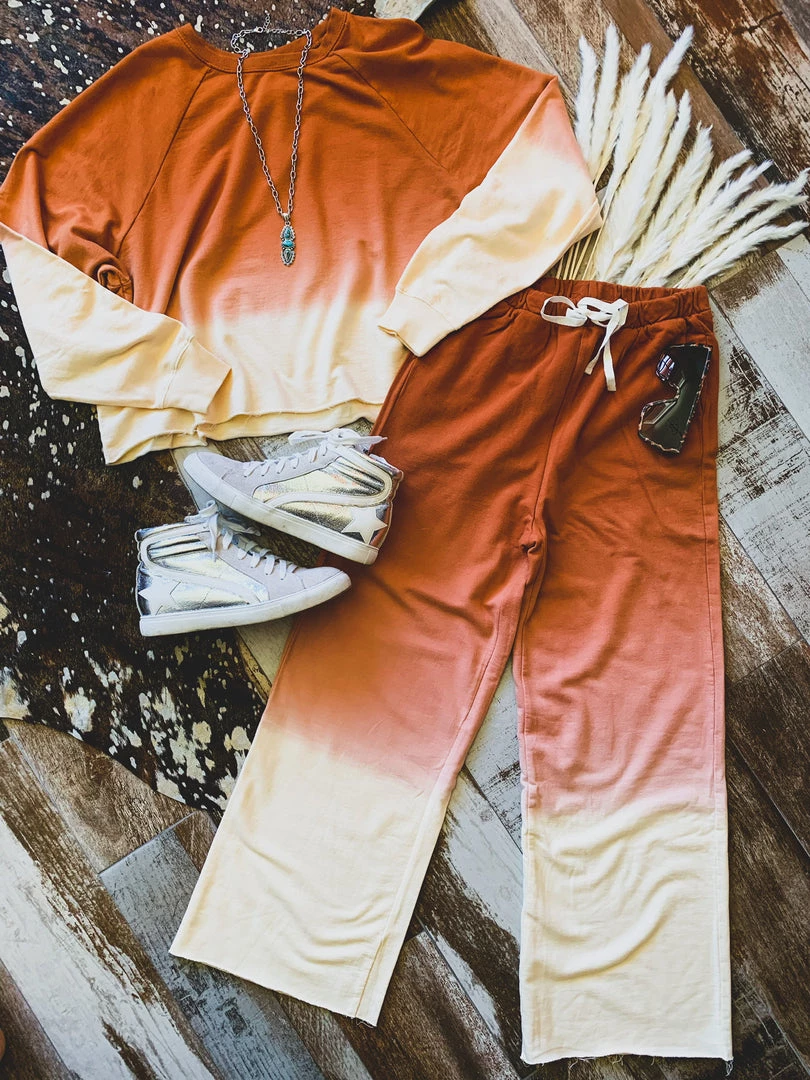 Rust ombre style dip dyed two piece set has us speechless! Top features a cropped raw hem length, a rust to cream ombre pattern, long sleeves with fitted wrist cuffs, and comfy relaxed fit. Pants feature a rust to cream ombre pattern, an adjustable drawstring waistband, front side pockets, and a cropped raw hem pant length. Such a cute set for Fall!