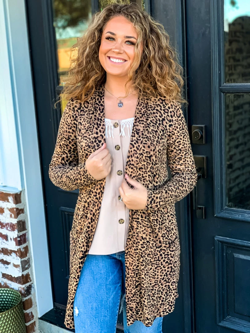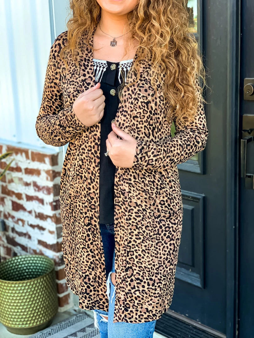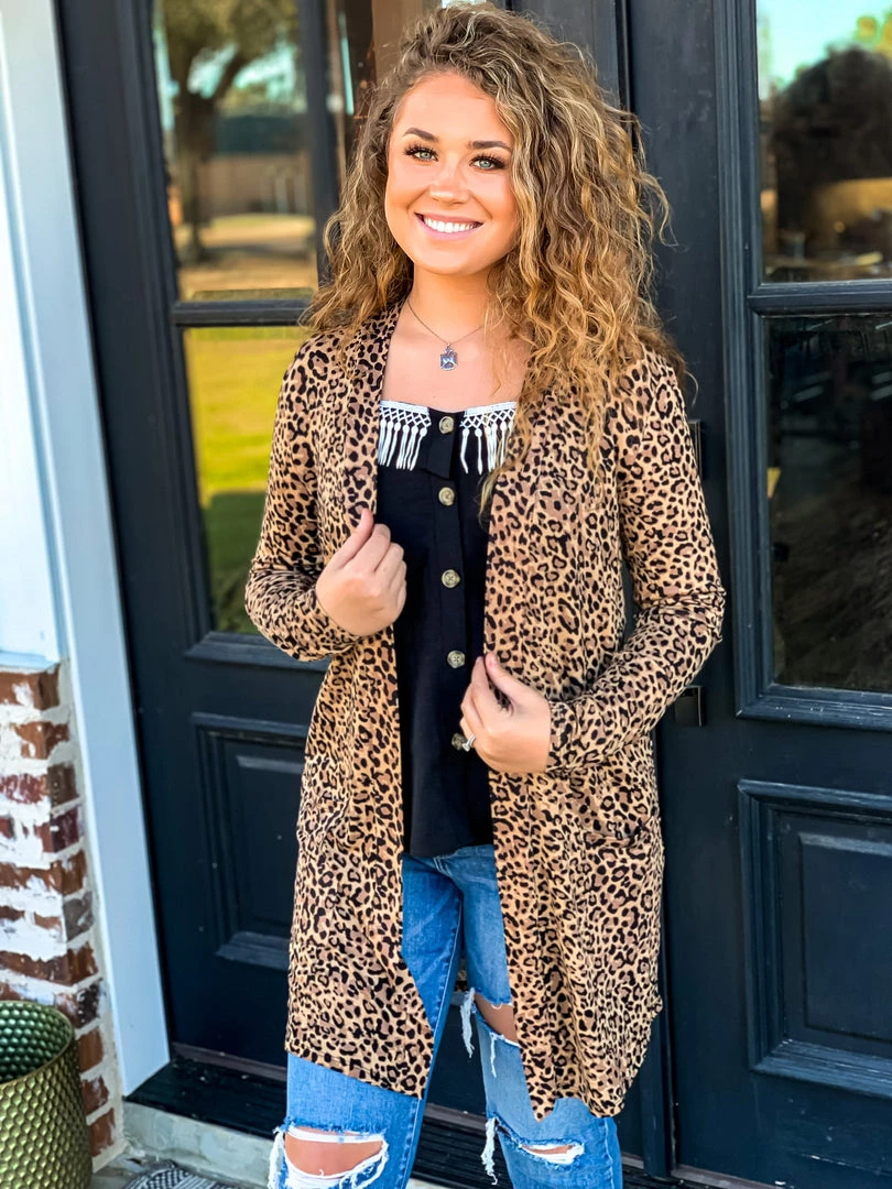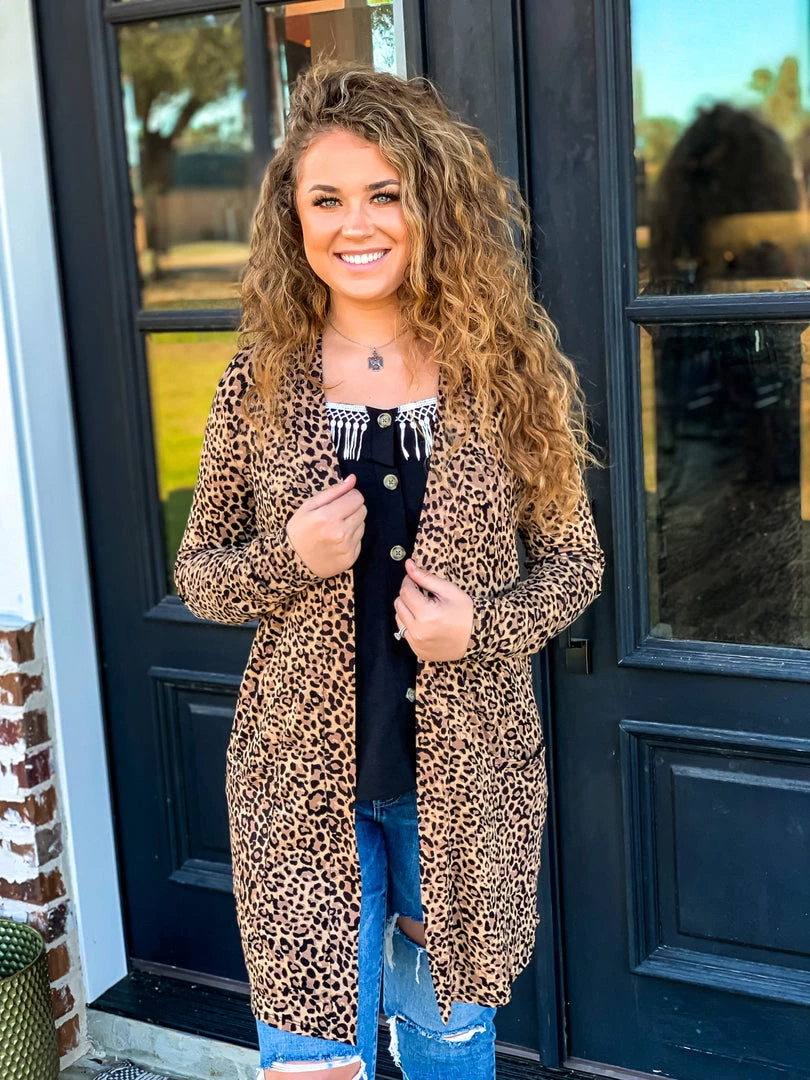 Beautiful tan leopard print cardigan is the perfect Fall piece. Features an all over brown/tan leopard print, a light weight material, the PERFECT length, open slip pocket on each side, fitted long sleeves, and a relaxed fit. Pair with your favorite tank tops, crops, and graphic tees for you new favorite look!
