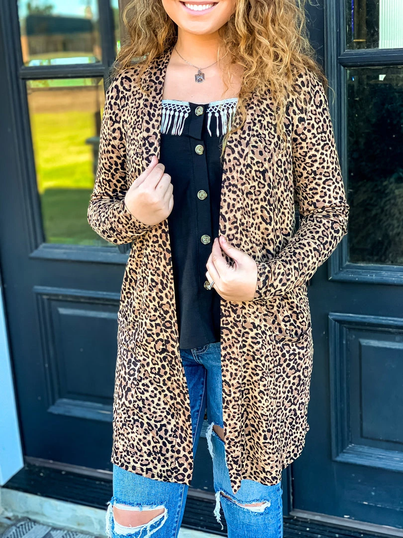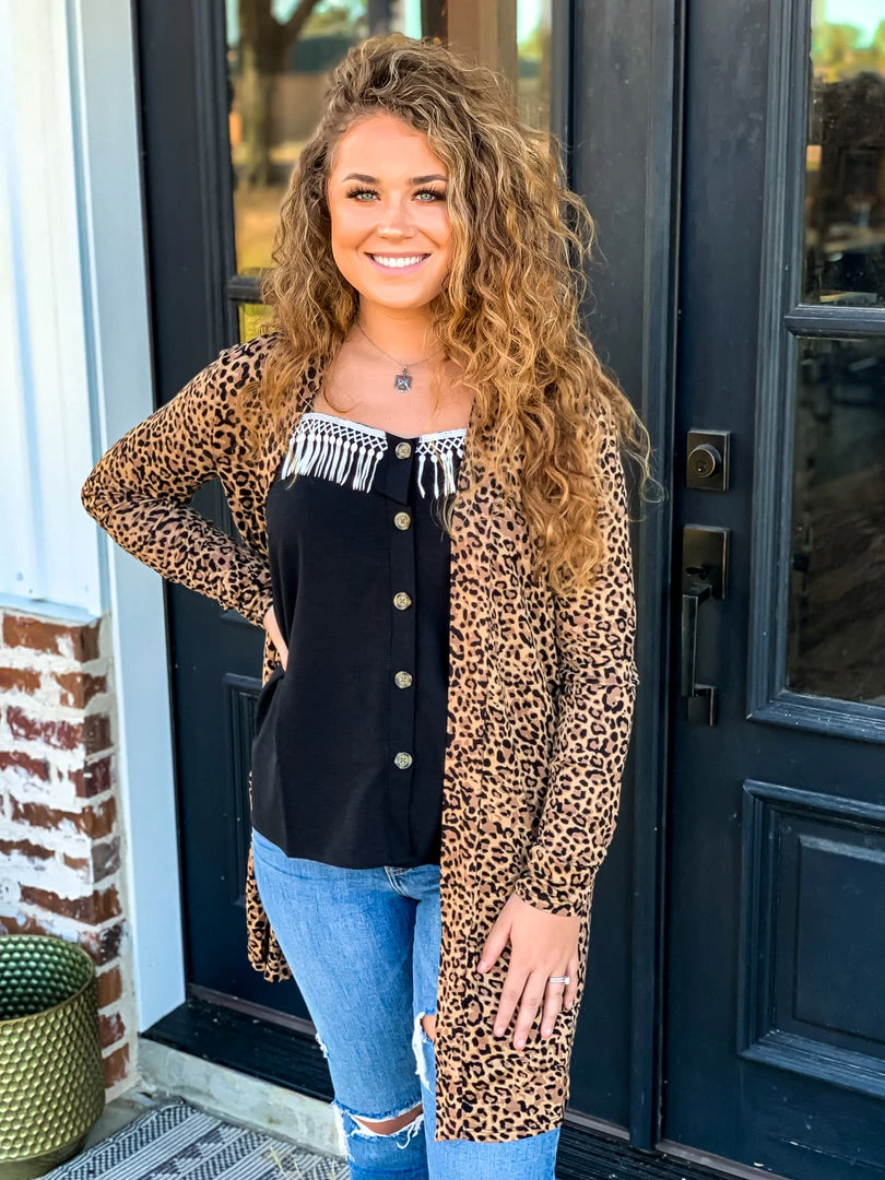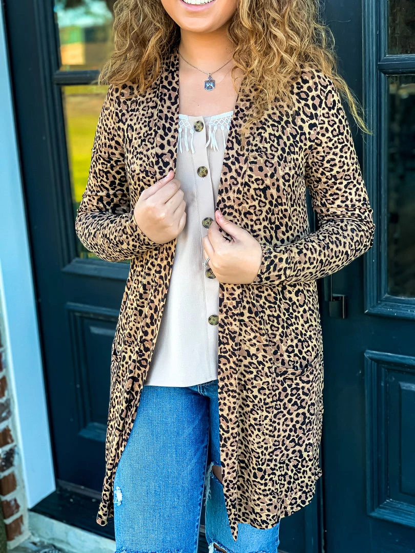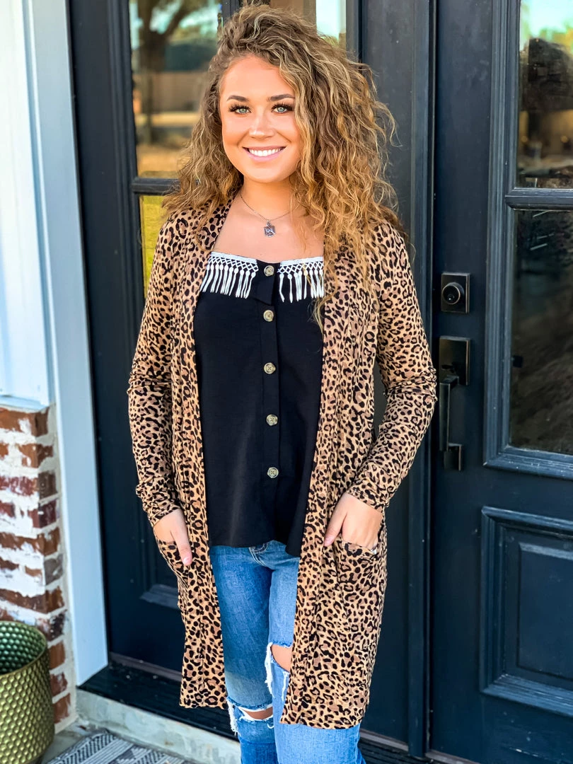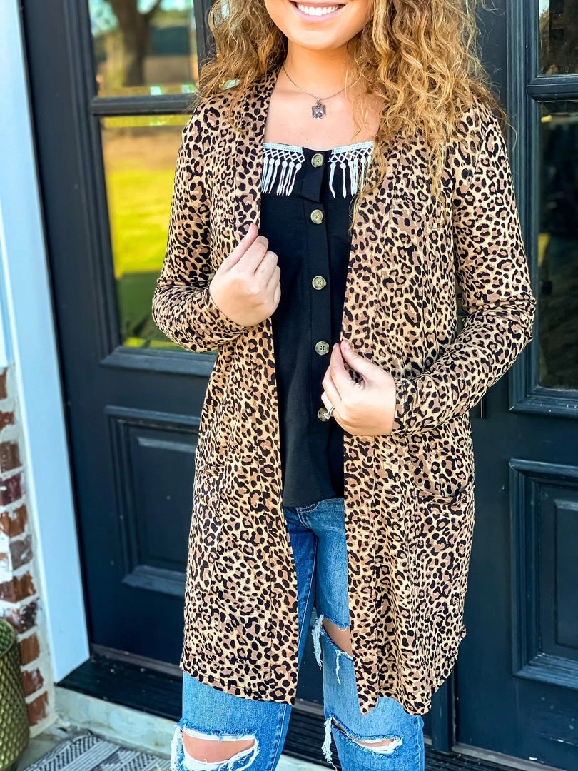 Beautiful tan leopard print cardigan is the perfect Fall piece. Features an all over brown/tan leopard print, a light weight material, the PERFECT length, open slip pocket on each side, fitted long sleeves, and a relaxed fit. Pair with your favorite tank tops, crops, and graphic tees for you new favorite look!
