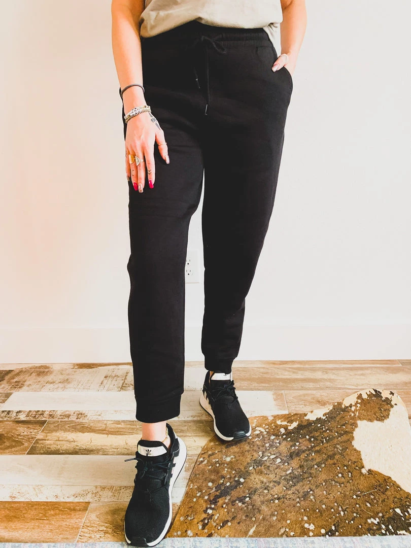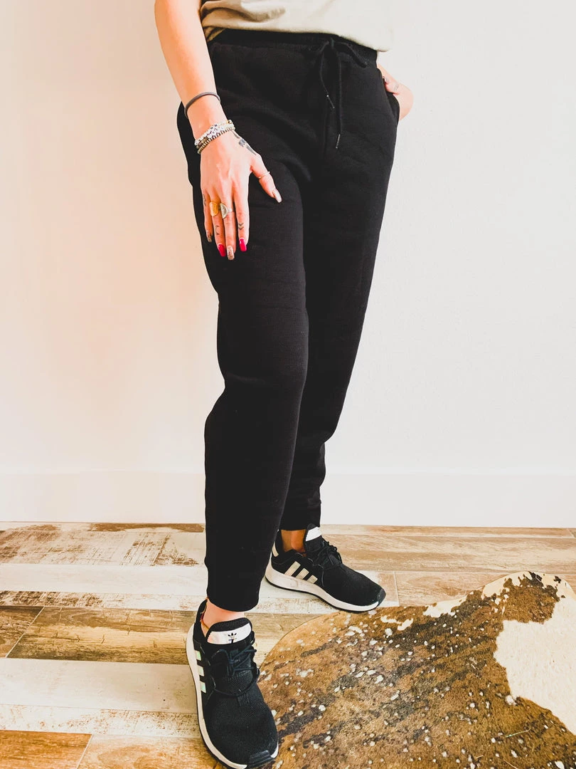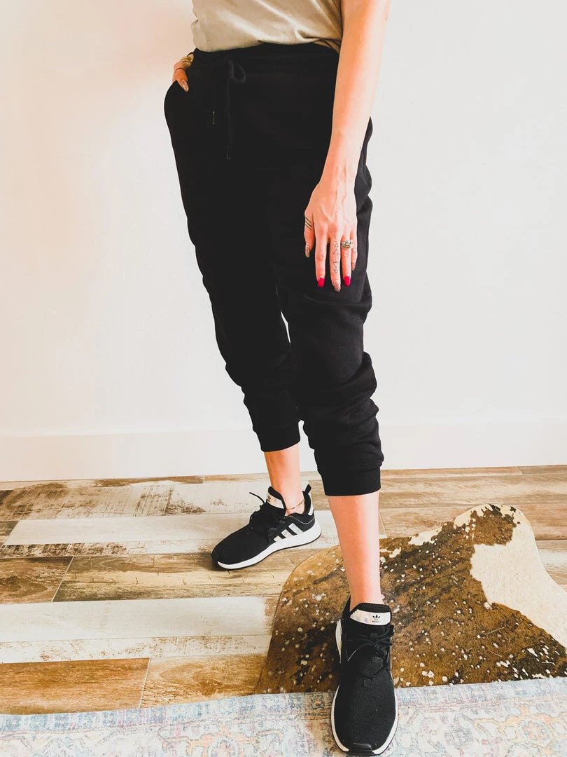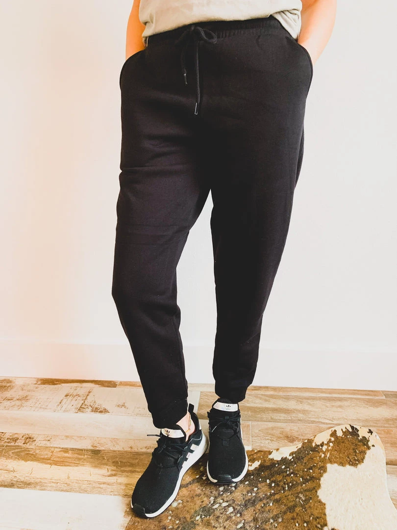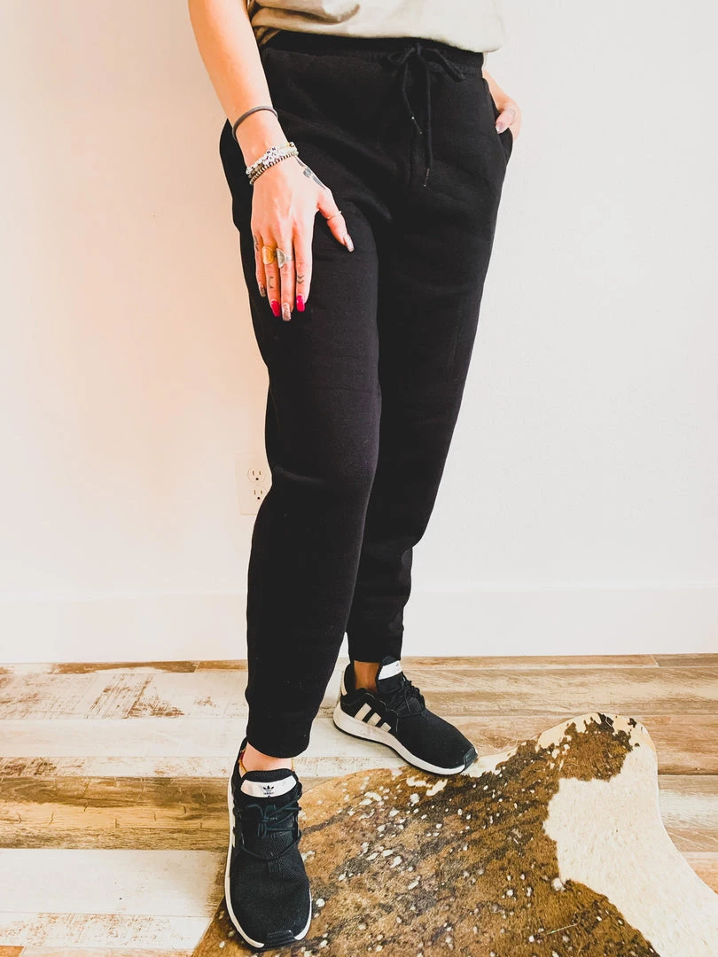 Black joggers have a thick comfy elastic waistband, drawstring, and elastic ankle cuffs. Joggers are so comfy and super cute to pair with all your graphic tees.Â