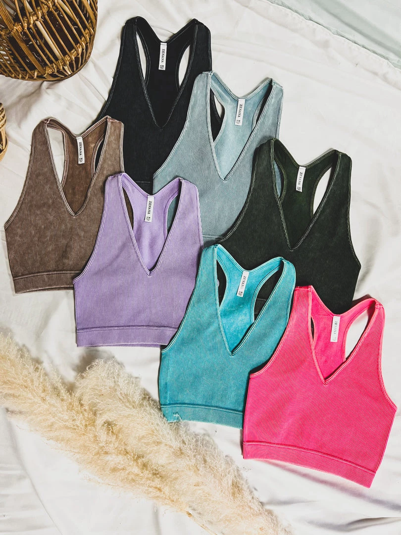 - V-neckline, thick straps, ribbed fabric, cropped length, racerback design, mineral vintage wash