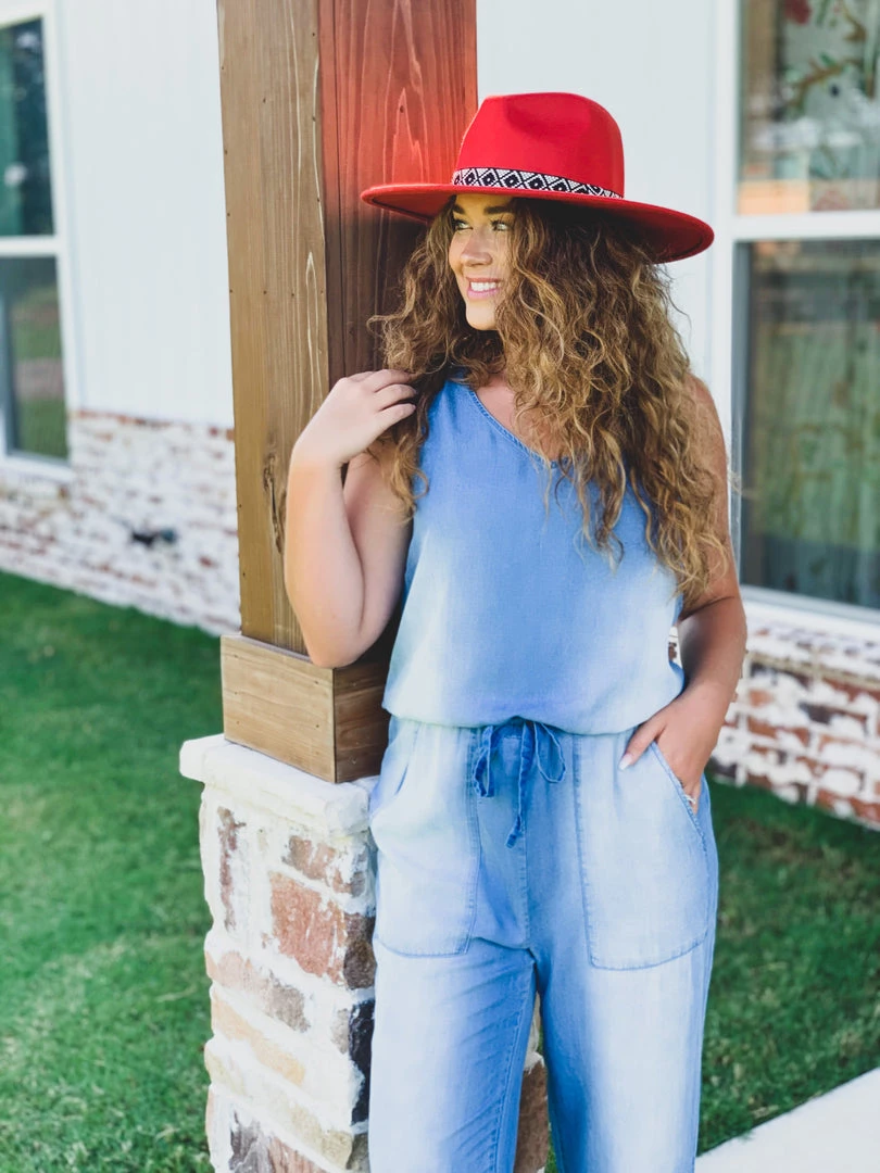 Blue denim colored jumpsuit is a complete must! Features a denim color, faded detail, a adjustable drawstring waistband, sleeveless design, v-neckline, front retro pockets, a keyhole back with button neck closure, and elastic ankle cuffs. Jumpsuit is so cute and perfect for any Season!