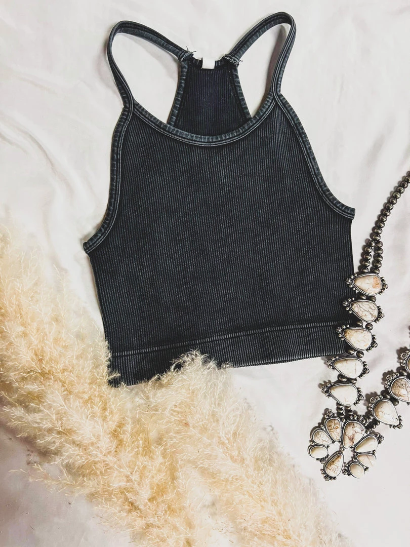 - High halter style neckline, cami straps, ribbed fabric, cropped length, mineral vintage wash